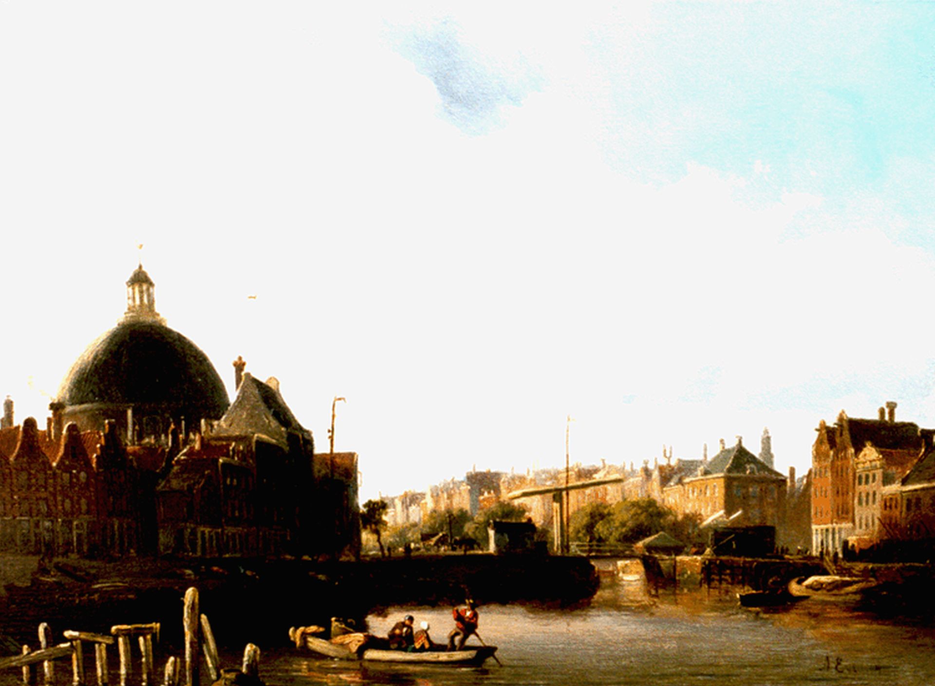 Adrianus Eversen kunstwerk • schilderij • voorheen te koop Pr. Hendrikkade en het Singel met Lutherse Kerk Amsterdam