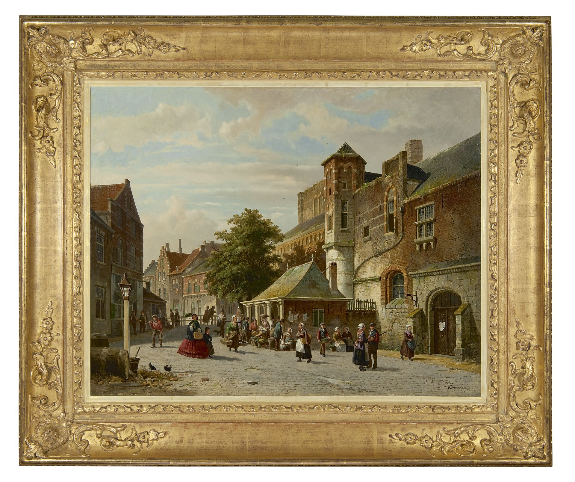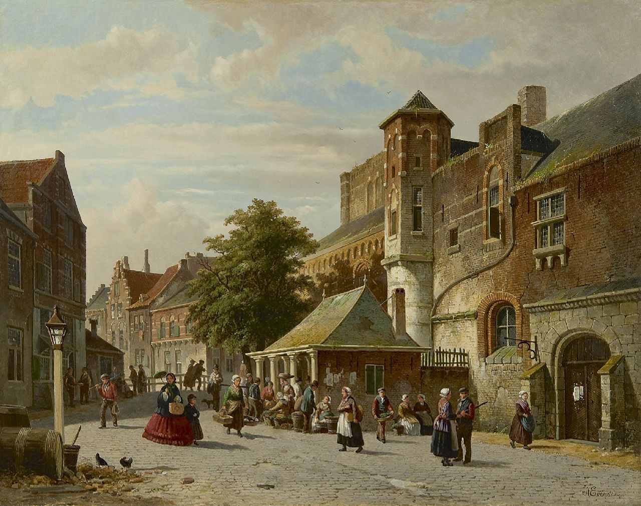 Adrianus Eversen kunstwerk • schilderij • voorheen te koop Stadsgezicht met overdekte visbank