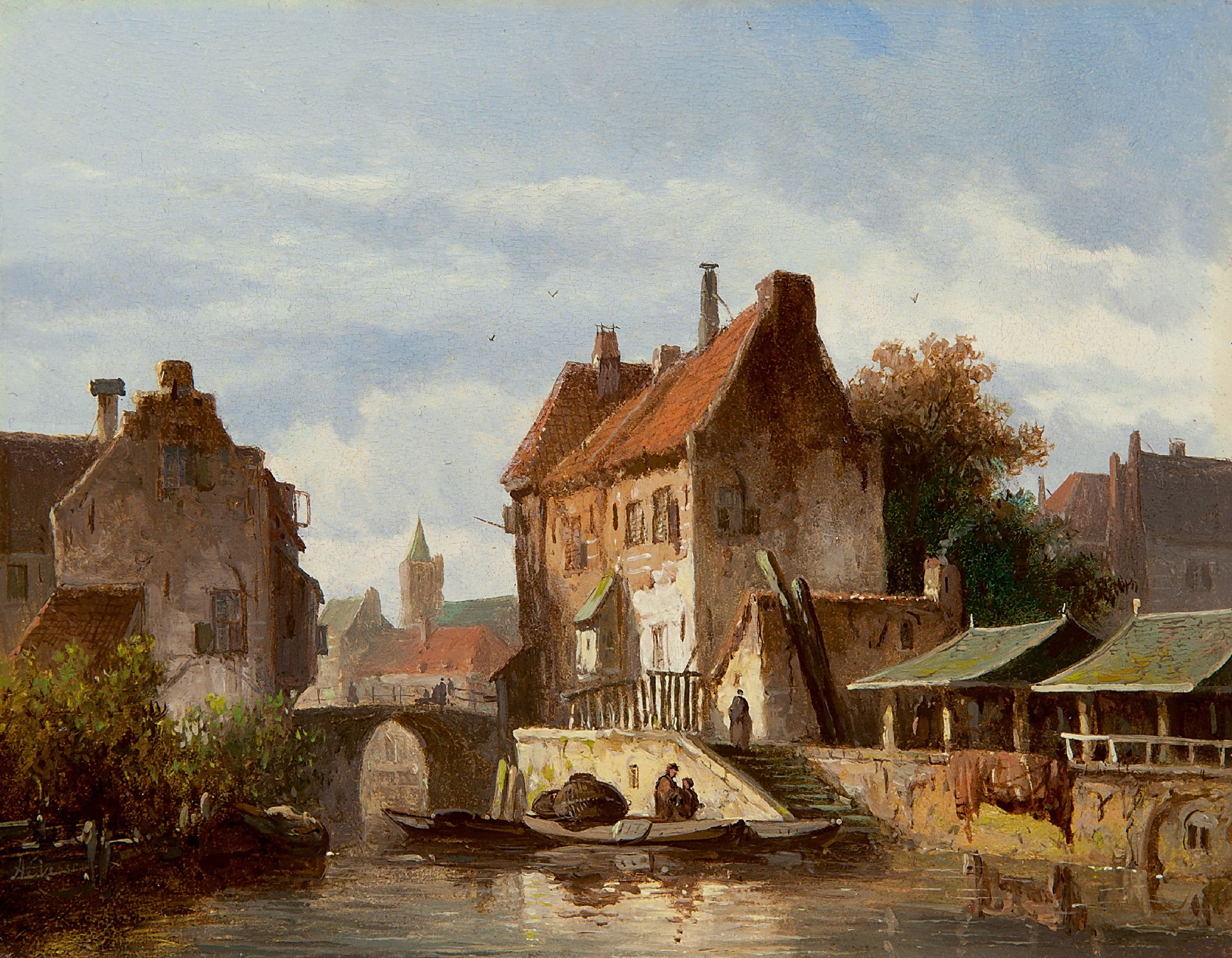 Adrianus Eversen kunstwerk • schilderij • voorheen te koop Stadsgrachtje met afgemeerde schuiten, Utrecht