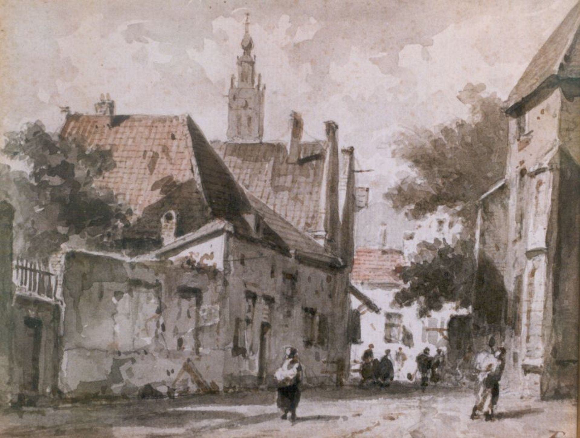 Adrianus Eversen kunstwerk • aquarel • tekening • voorheen te koop Straatje met wandelaars, Haarlem