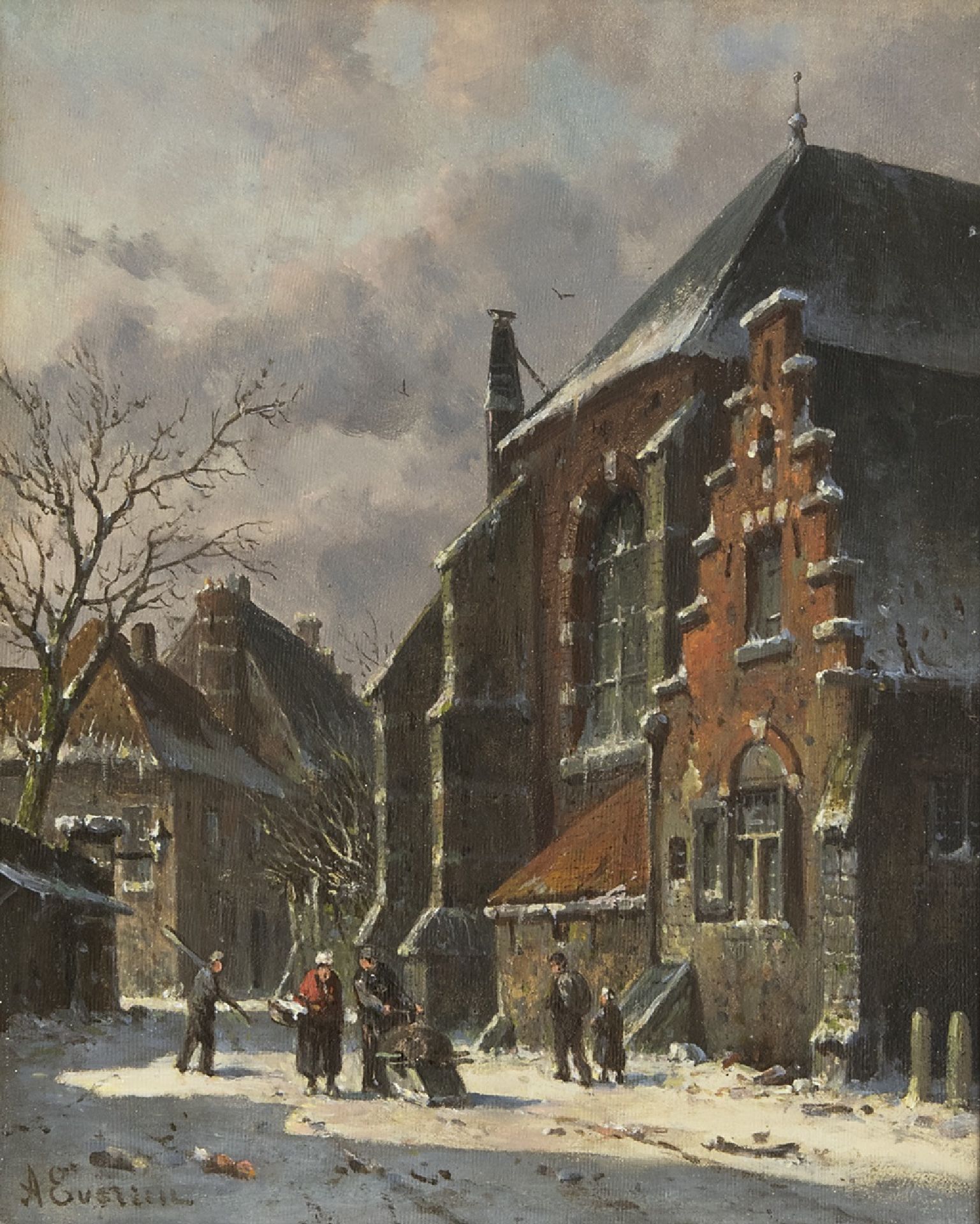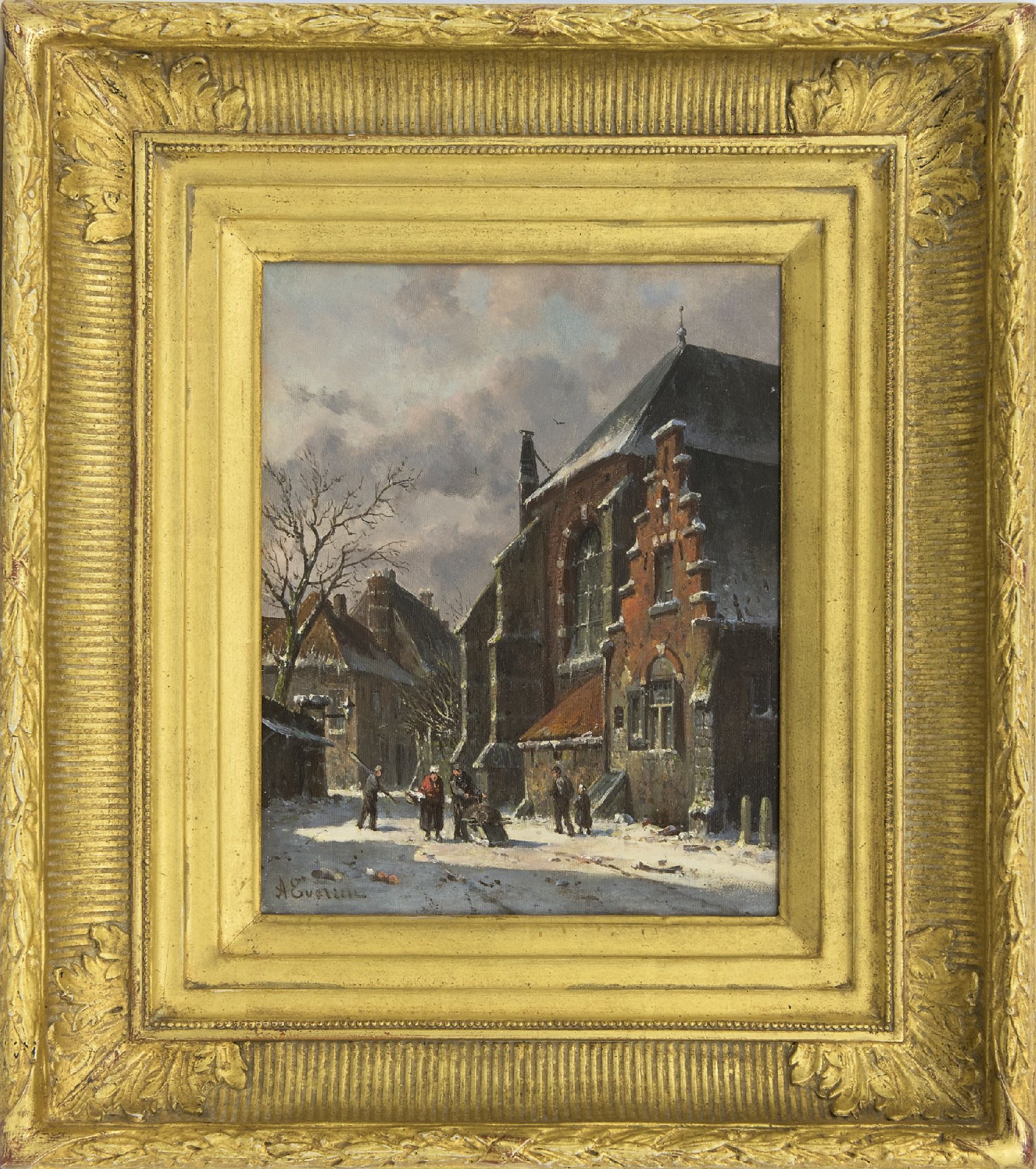 Adrianus Eversen kunstwerk • schilderij • voorheen te koop Winters stadsgezicht met figuren