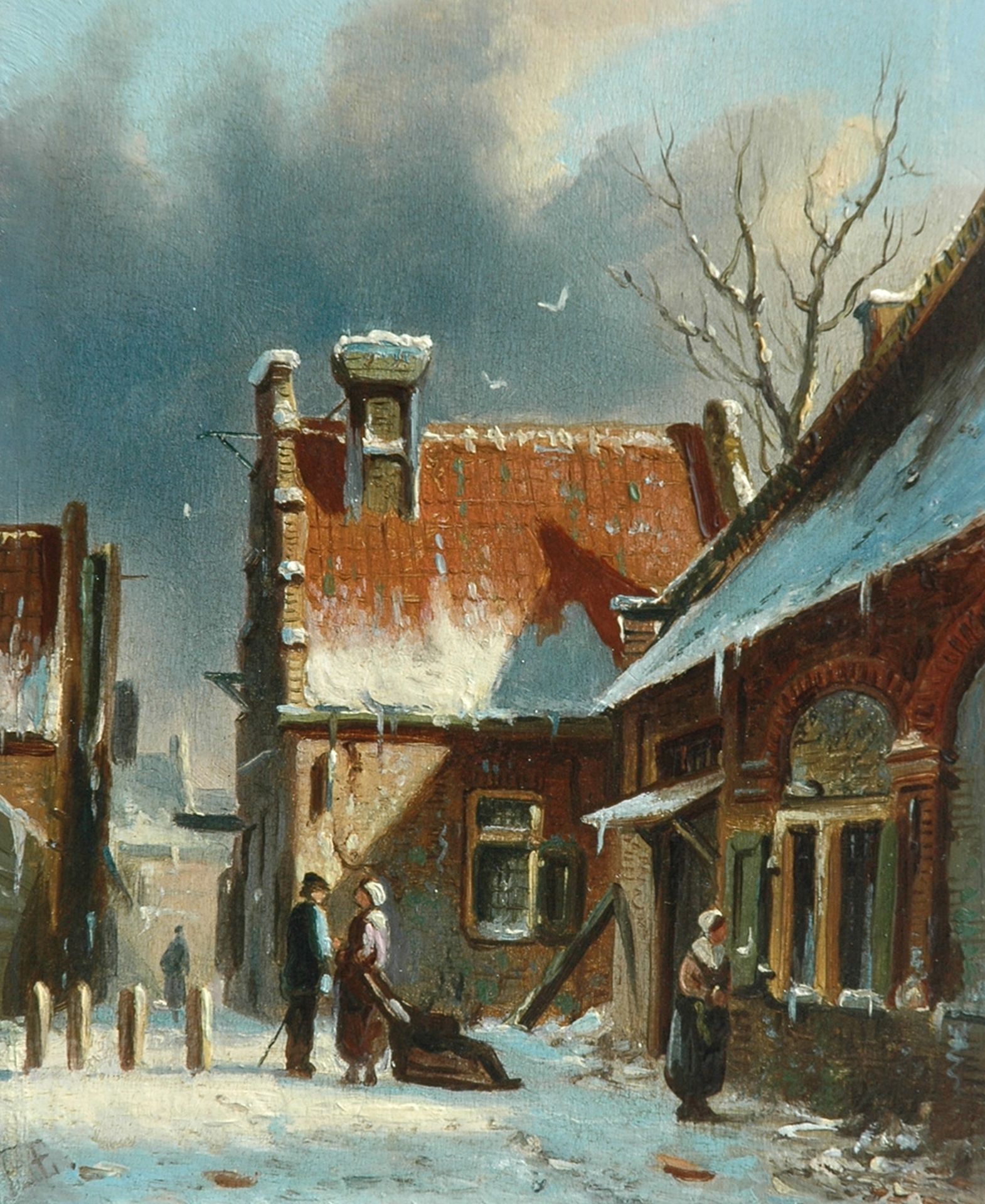 Adrianus Eversen kunstwerk • schilderij • voorheen te koop Winters straatje met figuren