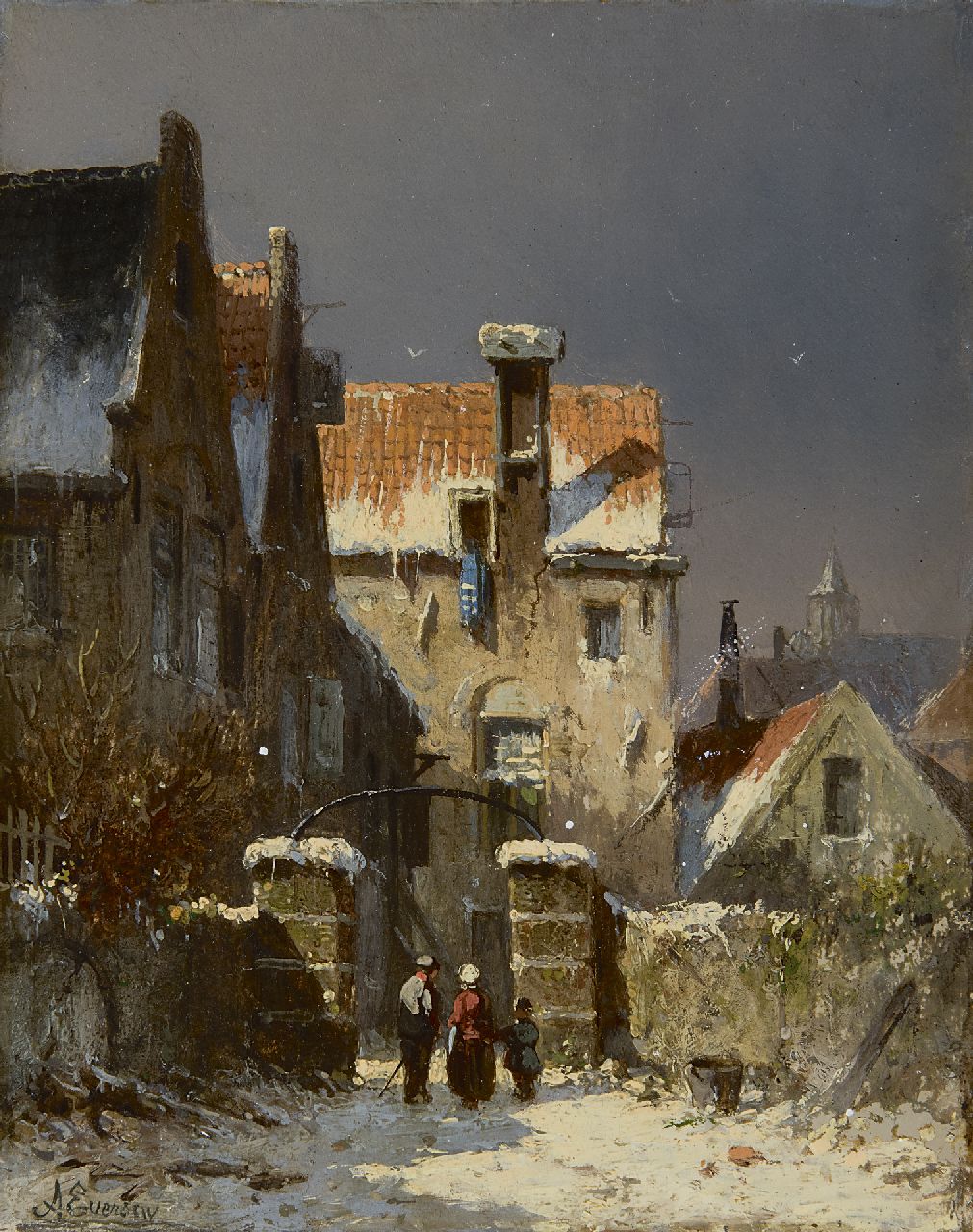 Adrianus Eversen kunstwerk • schilderij • voorheen te koop Winters straatje met figuren