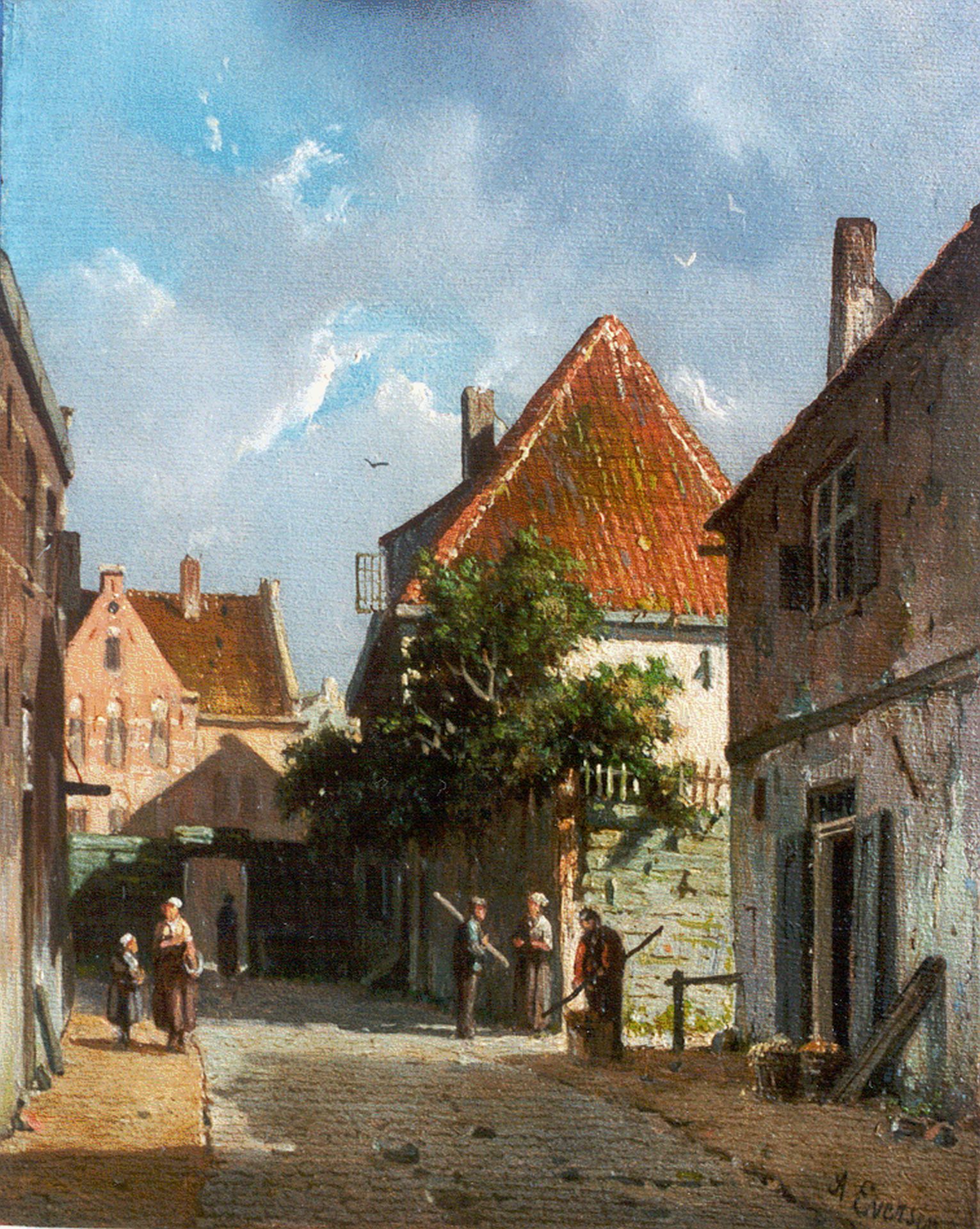 Adrianus Eversen kunstwerk • schilderij • voorheen te koop Zonnig straatje met figuren