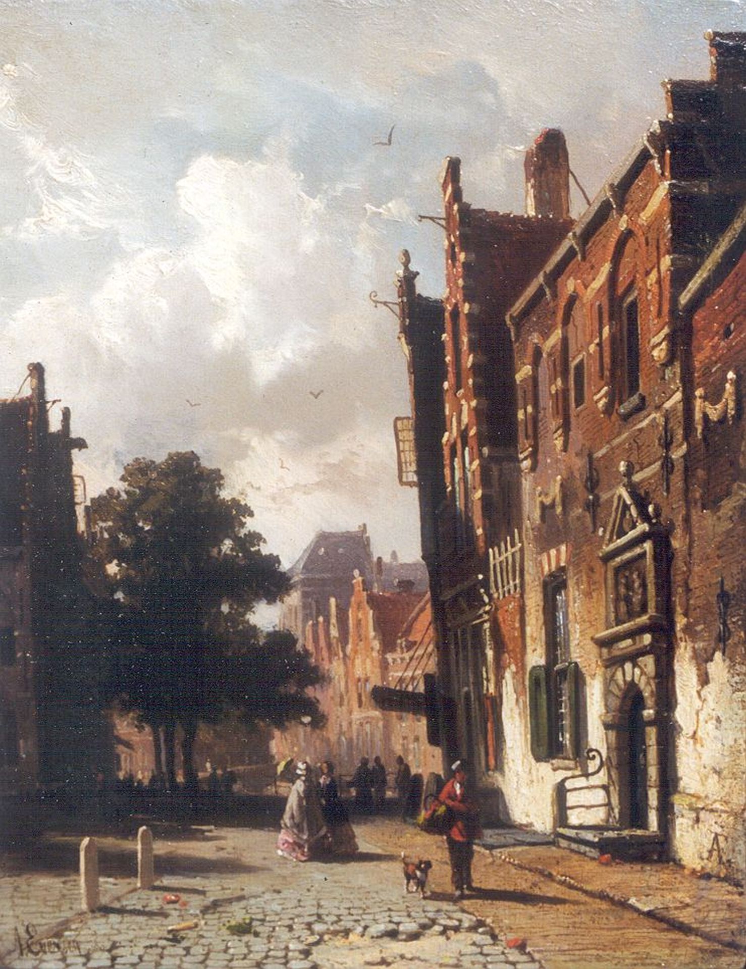 Adrianus Eversen kunstwerk • schilderij • voorheen te koop Zonnig straatje met figuren