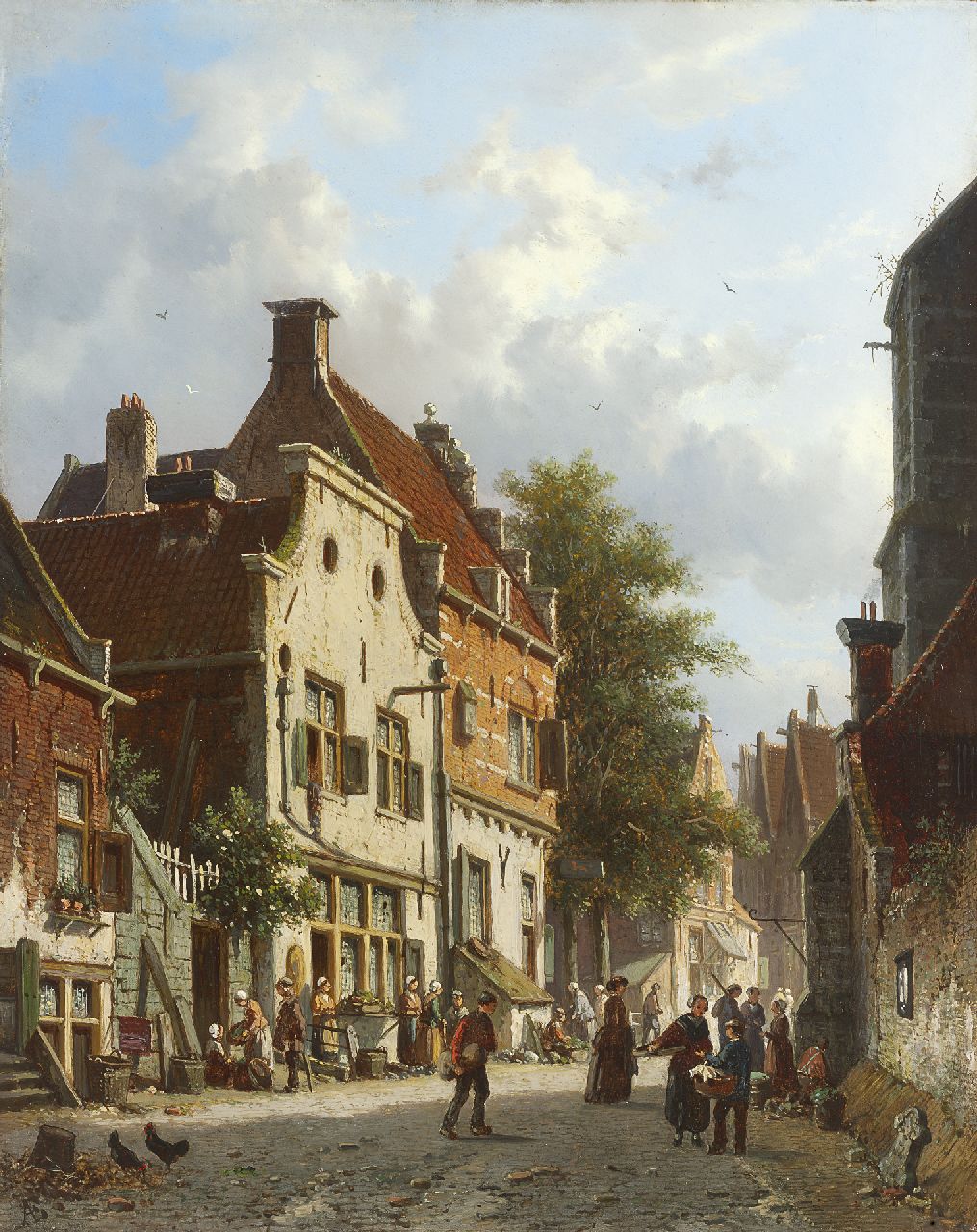Adrianus Eversen kunstwerk • schilderij • voorheen te koop Zonnig straatje met groenteverkoopsters