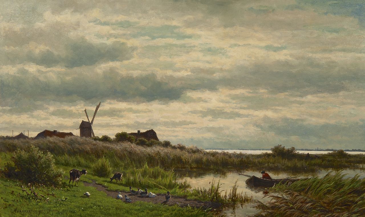 Adrianus van Everdingen kunstwerk • schilderij • voorheen te koop Hollands plaslandschap met visser