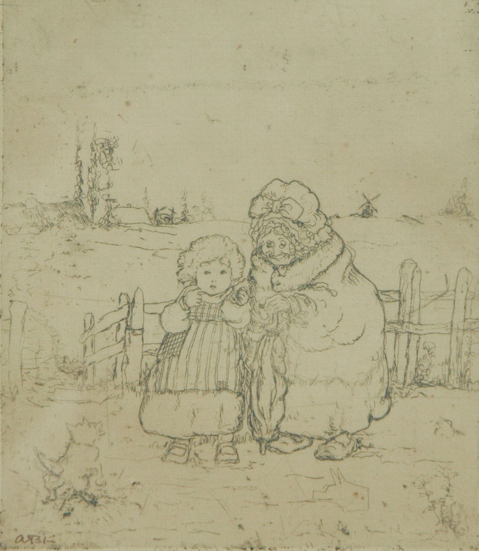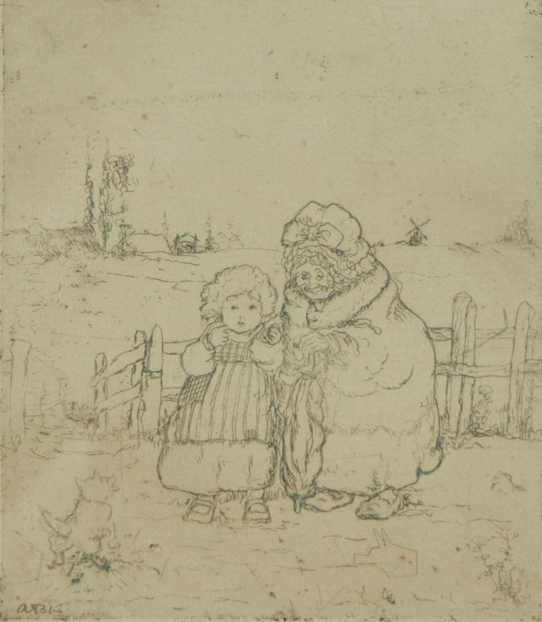 Adrienne Klinkhamer kunstwerk • grafiek • voorheen te koop Oma met kind aan de hand