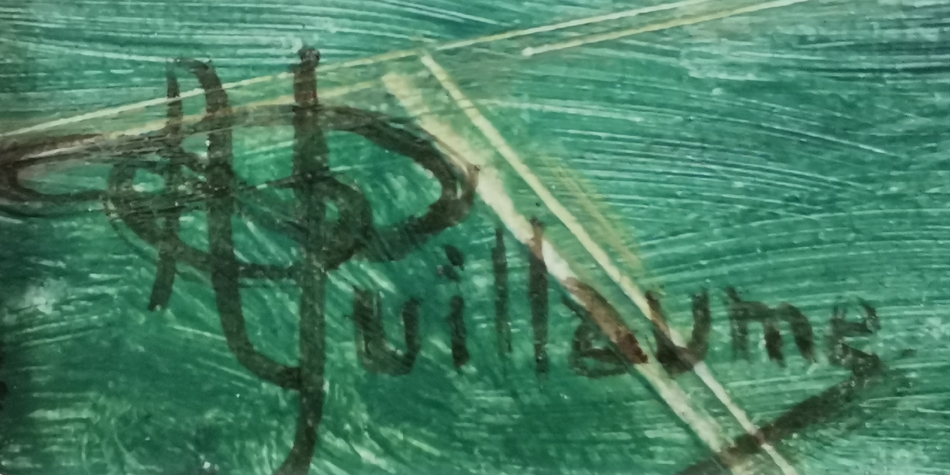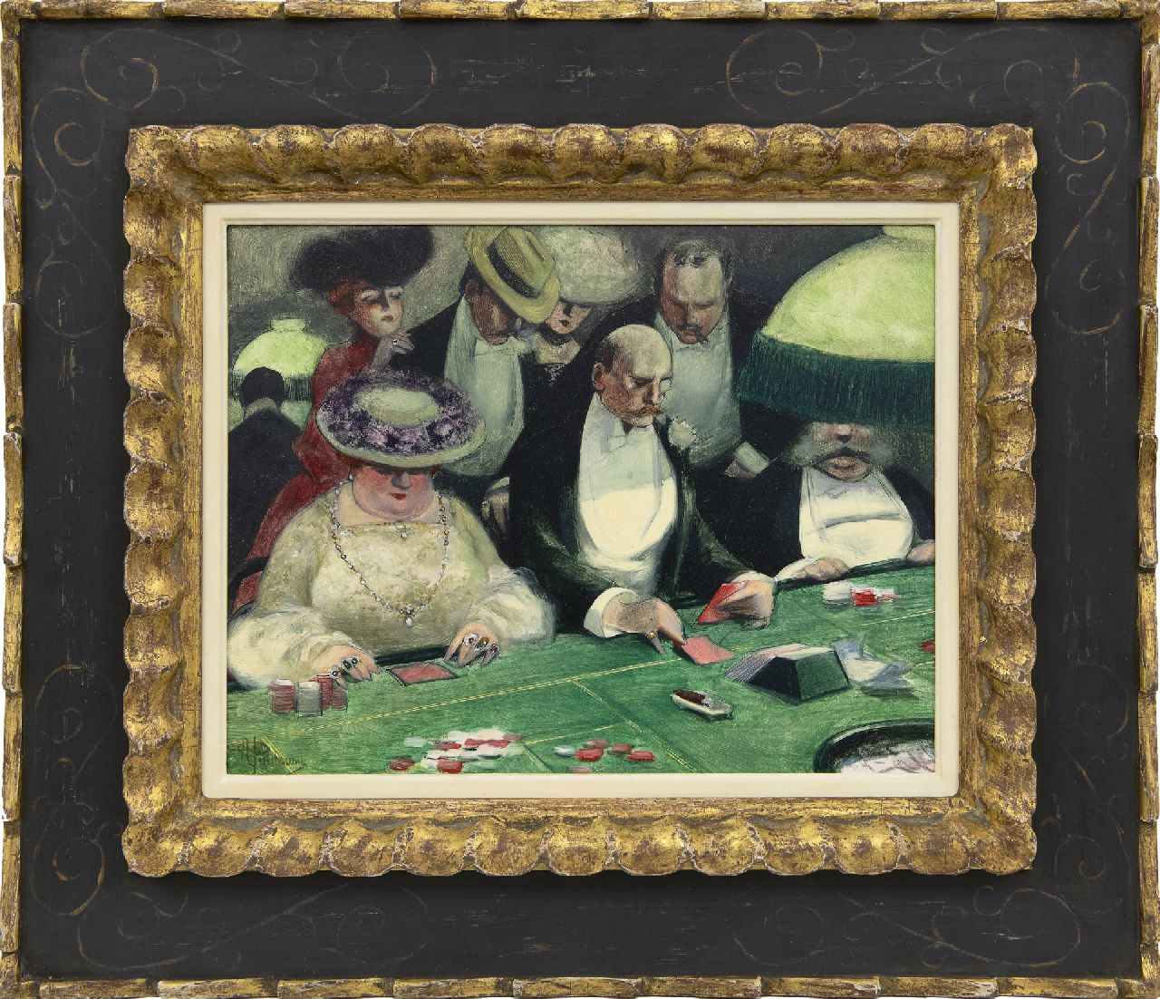 De Parijse kunstenaar Albert Guillaume is in de eerste plaats bekend geworden als karikaturist en illustrator van de populaire Franse spotbladen ‘La Caricature’ en ‘Le Rire’. Daarnaast maakte hij ontwerpen voor affiches. Zijn gave om zijn medemens kritisch te observeren en nuances in houding en gebaar in rake poses te verbeelden is terug te vinden in zijn schilderijen, zij het in mildere vorm. Het zijn vooral lichtvoetige scènes, die een beeld geven van het Parijse straat- en uitgaansleven in de decennia voor en na 1900: de grote boulevards met hun terrassen, de cabarets, speelzalen, music-halls en theaters, bevolkt door mooie vrouwen en welgeklede mannen. Geestig getroffen zijn deze drie spelers aan de blackjacktafel. Over hun rijkdom hoeft geen twijfel te bestaan. De weldoorvoede dame links draagt behalve een collier aan iedere vinger een kostbare ring. Haar buurman, met monocle en bloem in zijn knoopsgat, is tot in de puntjes verzorgd. Geen zorgen voor hem, zolang hij wint. Hij pakt een kaart, licht nerveus. Een gelukzoeker wellicht? In spanning kijken vier toeschouwers over zijn schouder mee. Meesterlijk getypeerd zijn hun gelaatsuitdrukking en houding, waarbij de dame geheel links nog eens laat zien hoe vertrouwd de schilder was met het ontwerpen van modieuze affiches. Guillaume publiceerde verschillende albums met tekeningen van het mondaine leven in Parijs, was actief als boekillustrator en ontwierp ook kostuums voor toneel en theater.