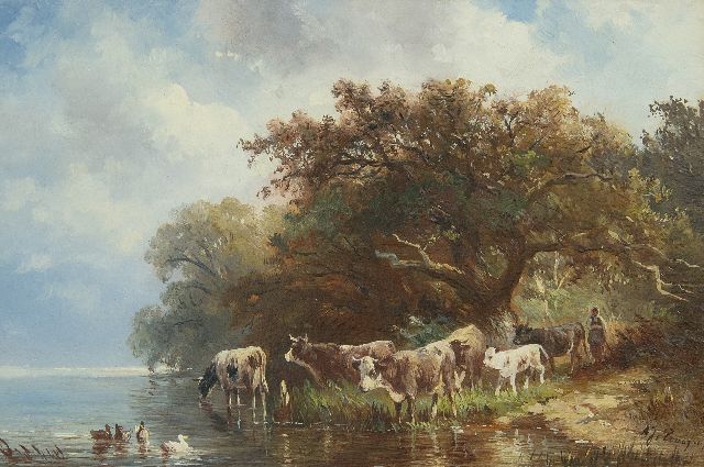 Albert Jurardus van Prooijen | Herderin met koeien langs de oever van een rivier, olieverf op paneel, 19,7 x 29,1 cm, gesigneerd r.o.