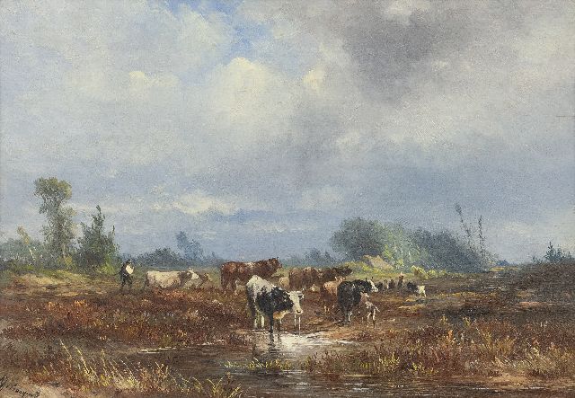 Albert Jurardus van Prooijen | Heidelandschap met herders en vee, olieverf op paneel, 19,7 x 28,5 cm, gesigneerd l.o.