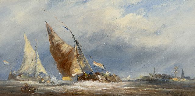 Albert Jurardus van Prooijen | Laverende tjalken bij stormweer, olieverf op paneel, 14,7 x 29,4 cm, gesigneerd r.o.