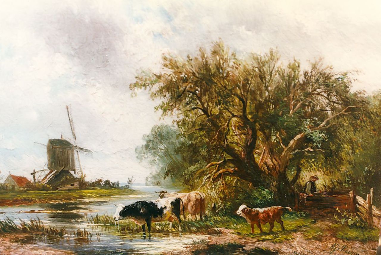 Albert Jurardus van Prooijen kunstwerk • schilderij • voorheen te koop Rivierlandschap met koeien bij een molen