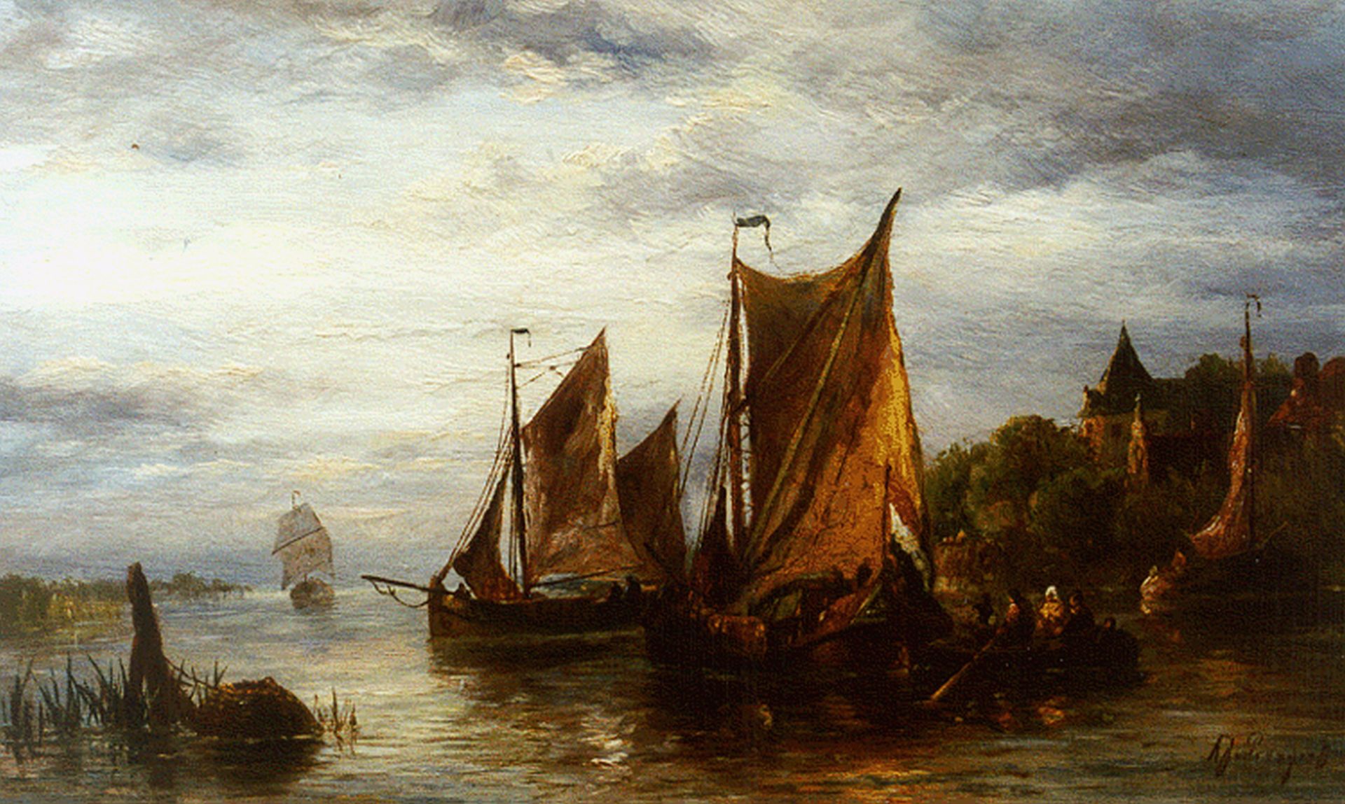Albert Jurardus van Prooijen kunstwerk • schilderij • voorheen te koop Zeilschepen in een havenmond