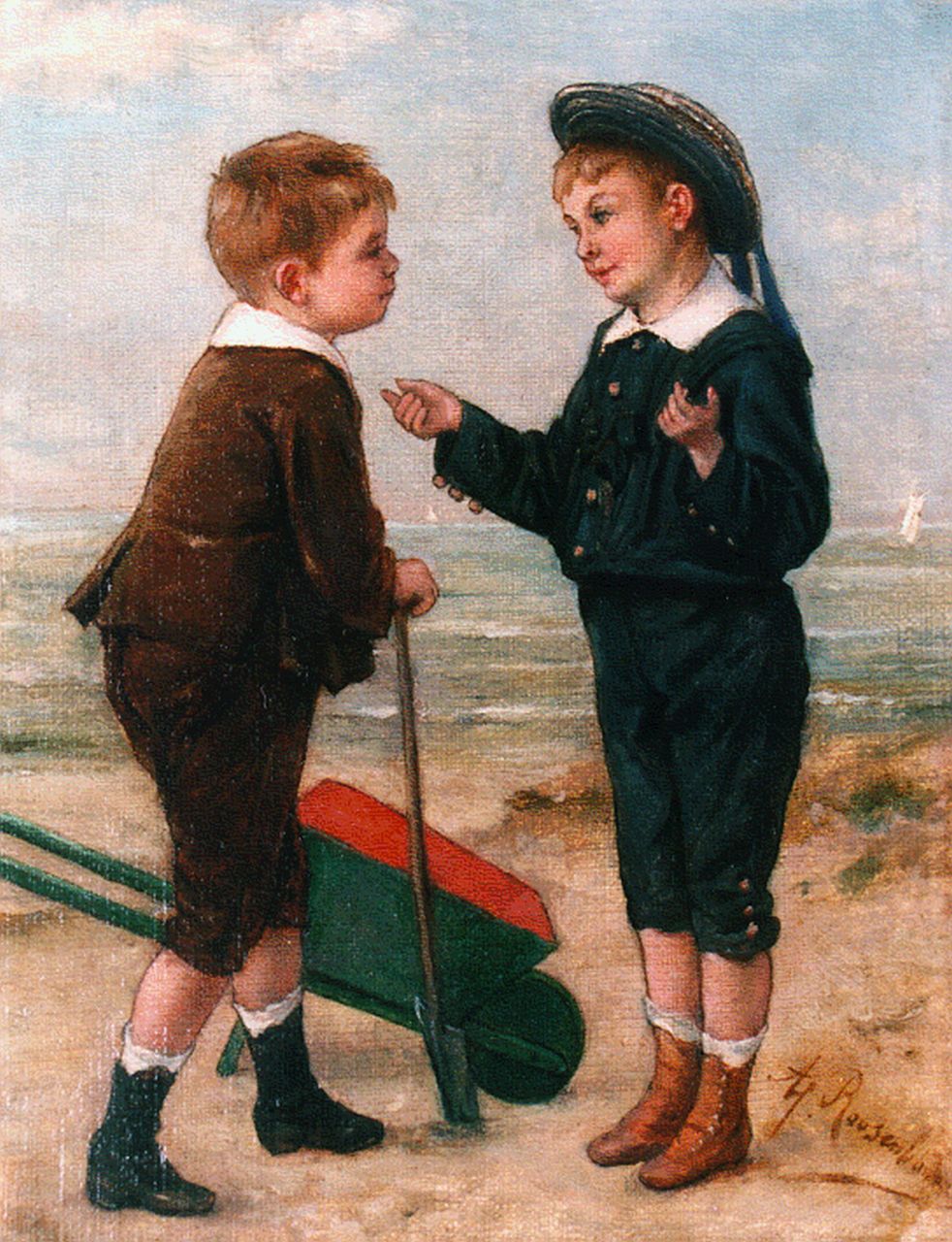 Albert Roosenboom kunstwerk • schilderij • voorheen te koop Twee vriendjes met kruiwagen aan het strand
