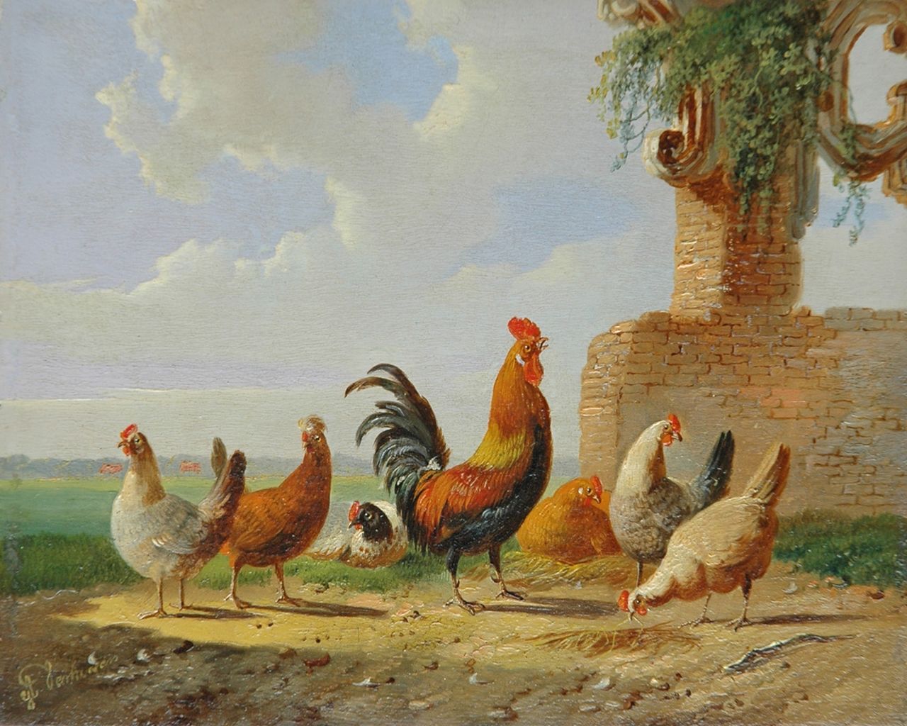 Albertus Verhoesen kunstwerk • schilderij • voorheen te koop Een haan en zes kippen in een zomerlandschap
