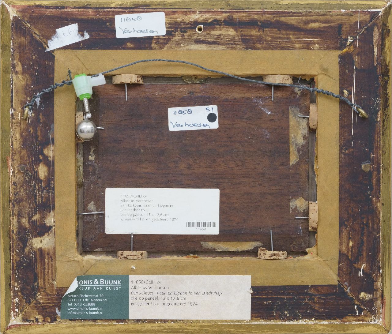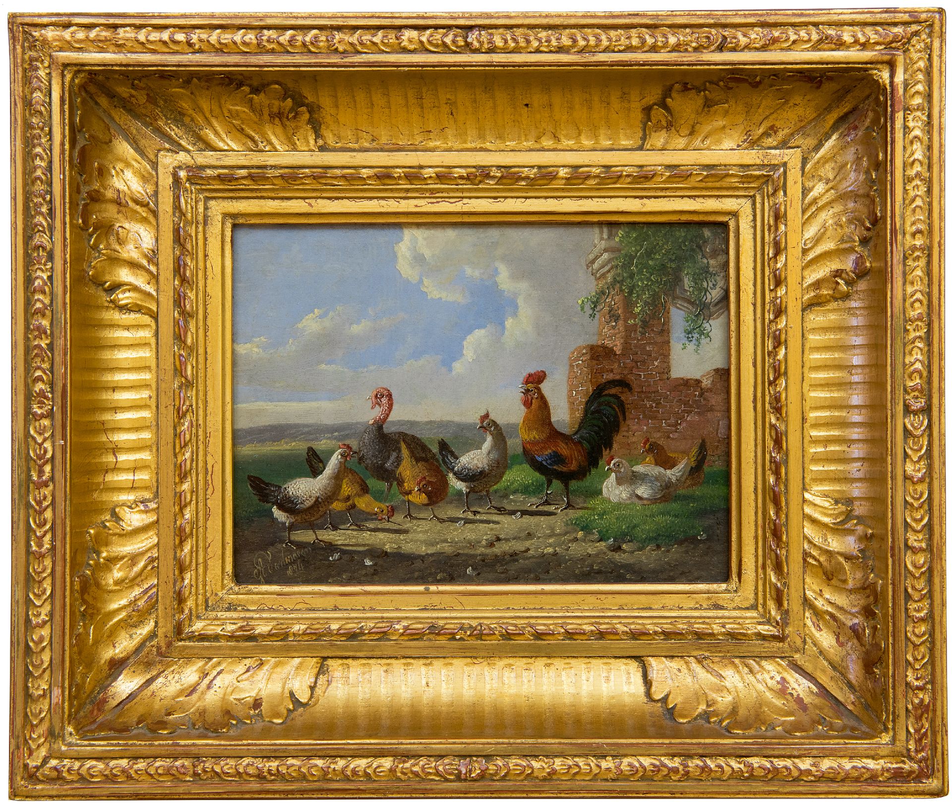Albertus Verhoesen kunstwerk • schilderij • voorheen te koop Een kalkoen, haan en kippen in een landschap