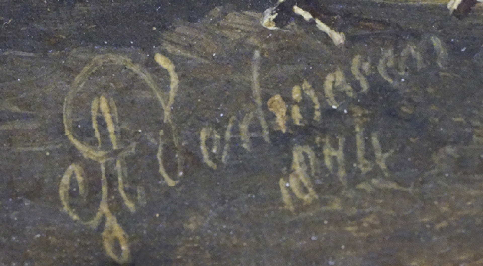 olieverf op paneel 13,0 x 17,6 cm, gesigneerd linksonder en gedateerd 1874