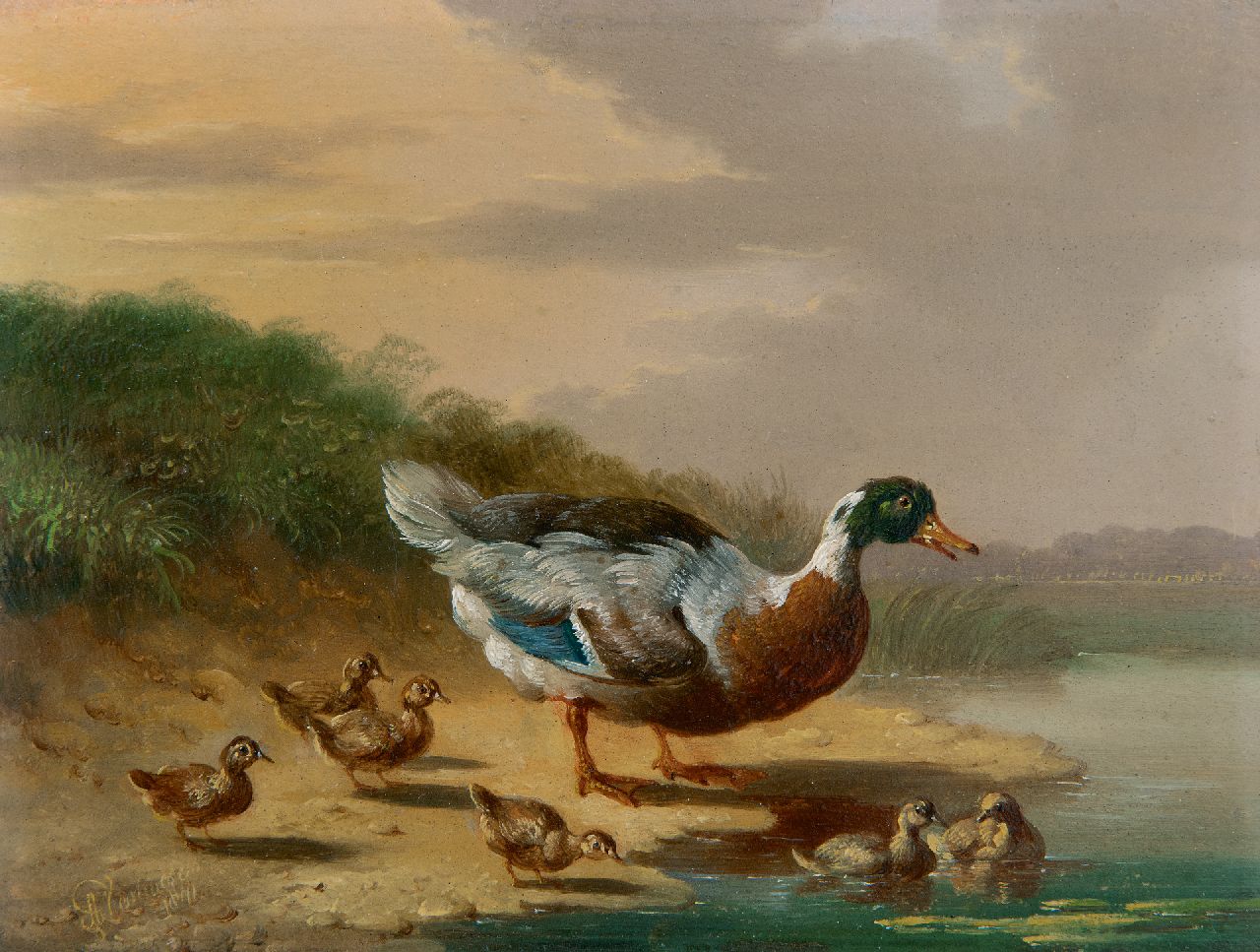 Albertus Verhoesen kunstwerk • schilderij • voorheen te koop Eend met kuikens aan het water