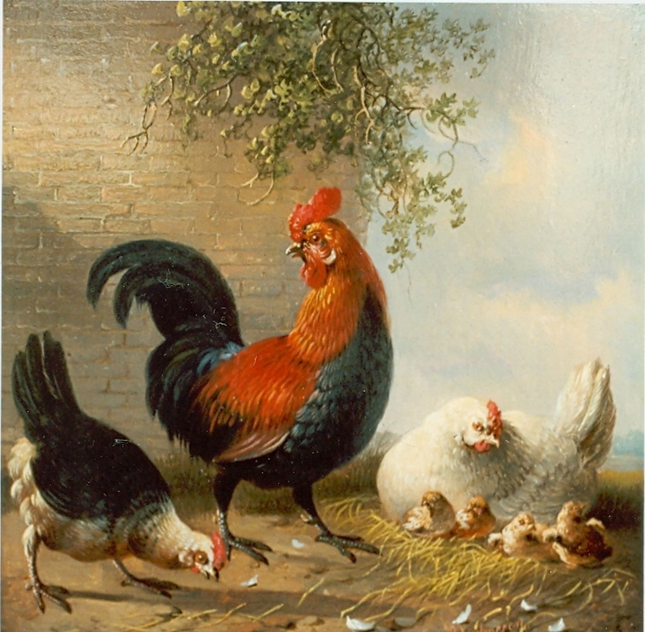 Albertus Verhoesen kunstwerk • schilderij • voorheen te koop Haan en kip met kuikens op een erf