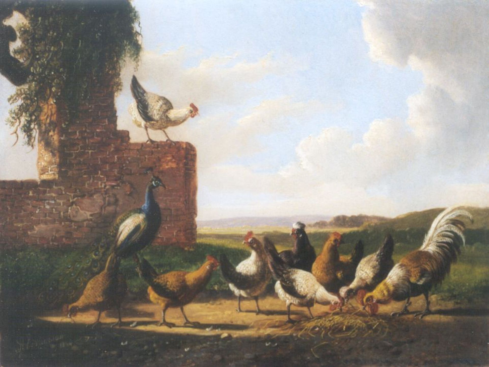 Albertus Verhoesen kunstwerk • schilderij • voorheen te koop Haan, kippen en een pauw bij een ruïne