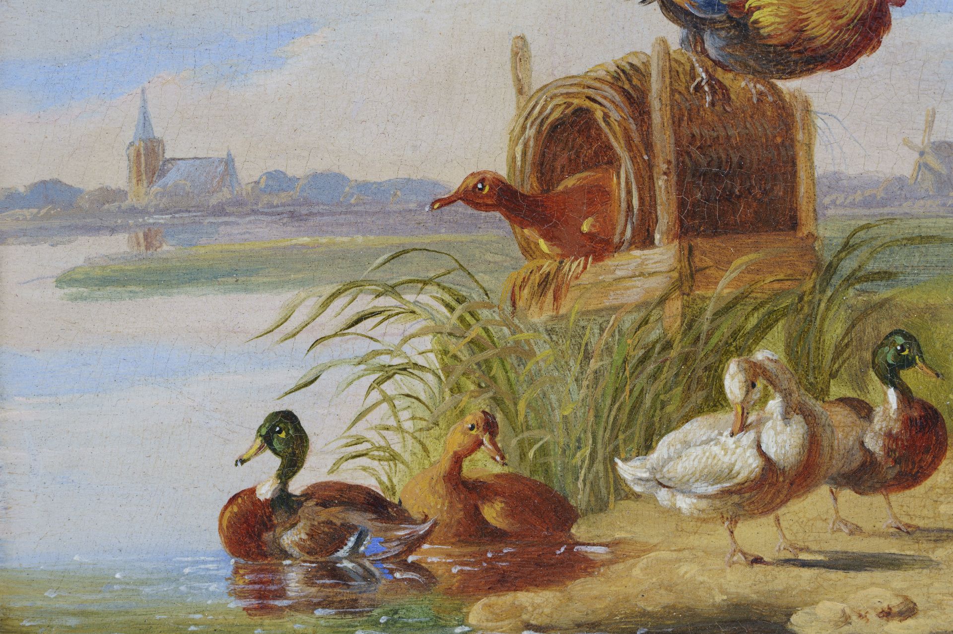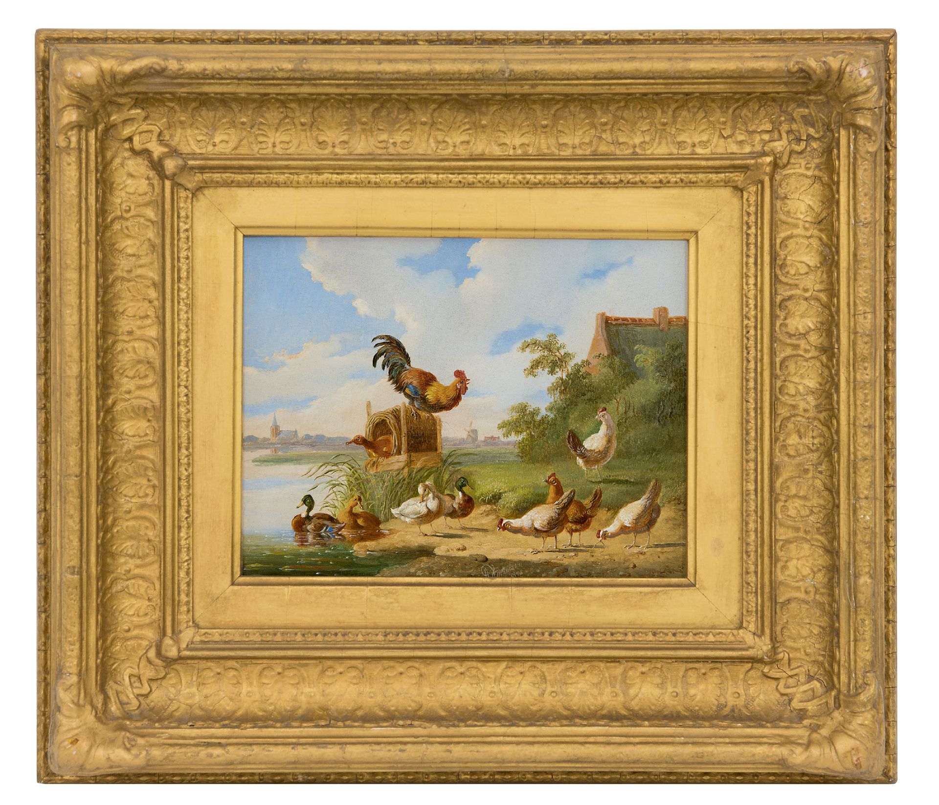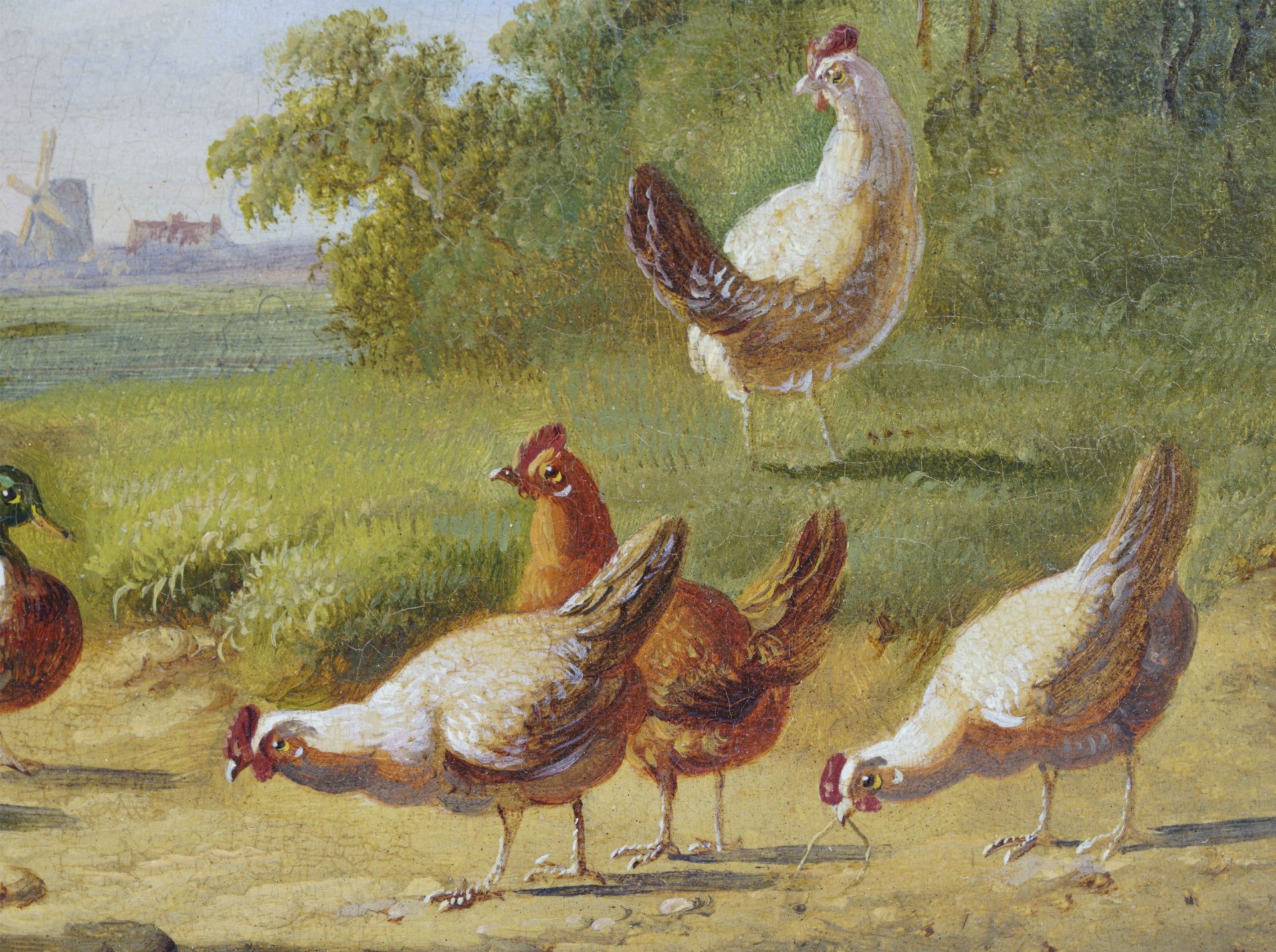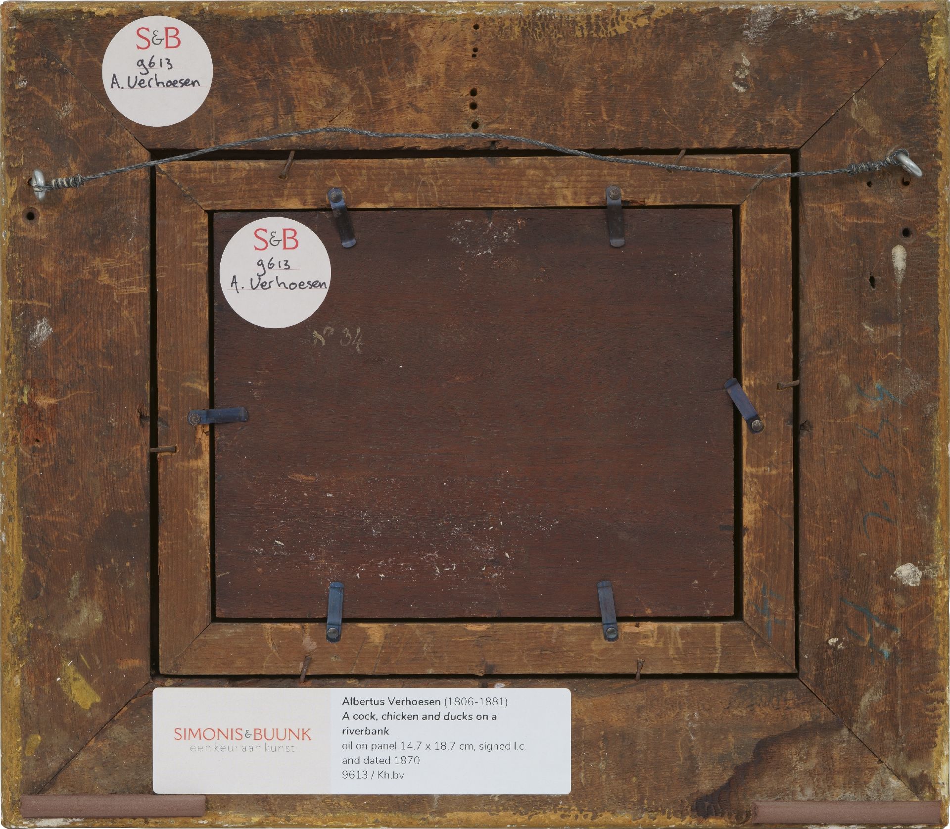 Albertus Verhoesen kunstwerk • schilderij • voorheen te koop Haan, kippen en eenden op een Hollandse rivieroever
