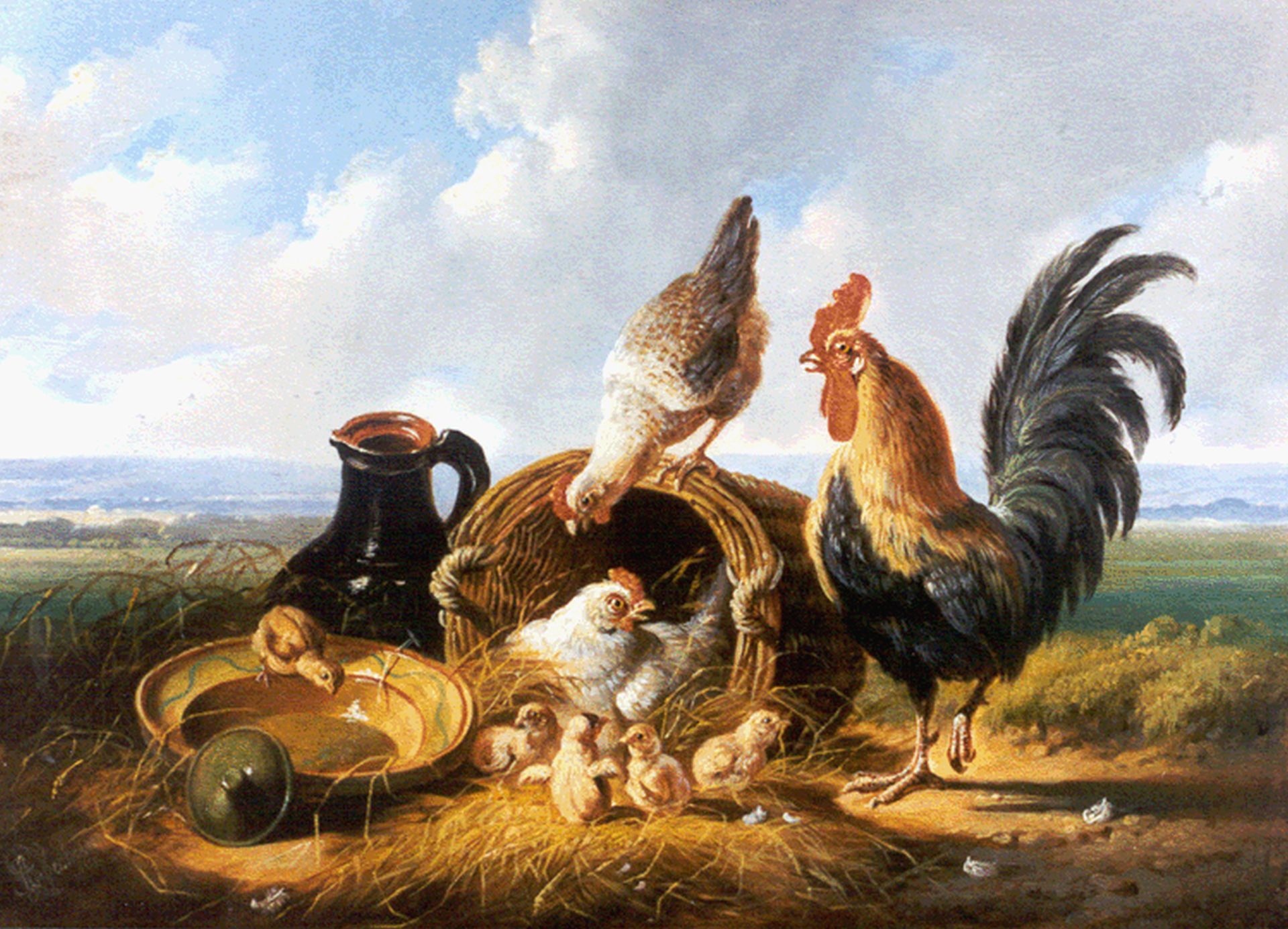 Albertus Verhoesen kunstwerk • schilderij • voorheen te koop Haan met hen en kuikens in een landschap