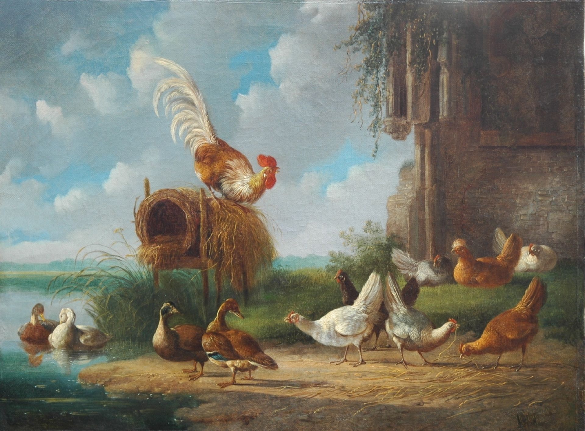 Albertus Verhoesen kunstwerk • schilderij • voorheen te koop Haan met sierkippen en eenden aan de waterkant