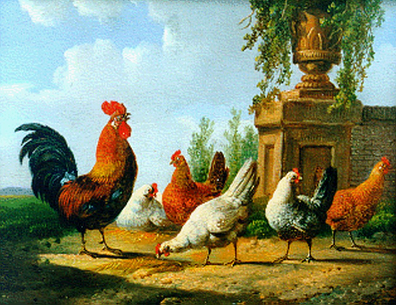 Albertus Verhoesen kunstwerk • schilderij • voorheen te koop Haan met vijf kippen bij een muurtje
