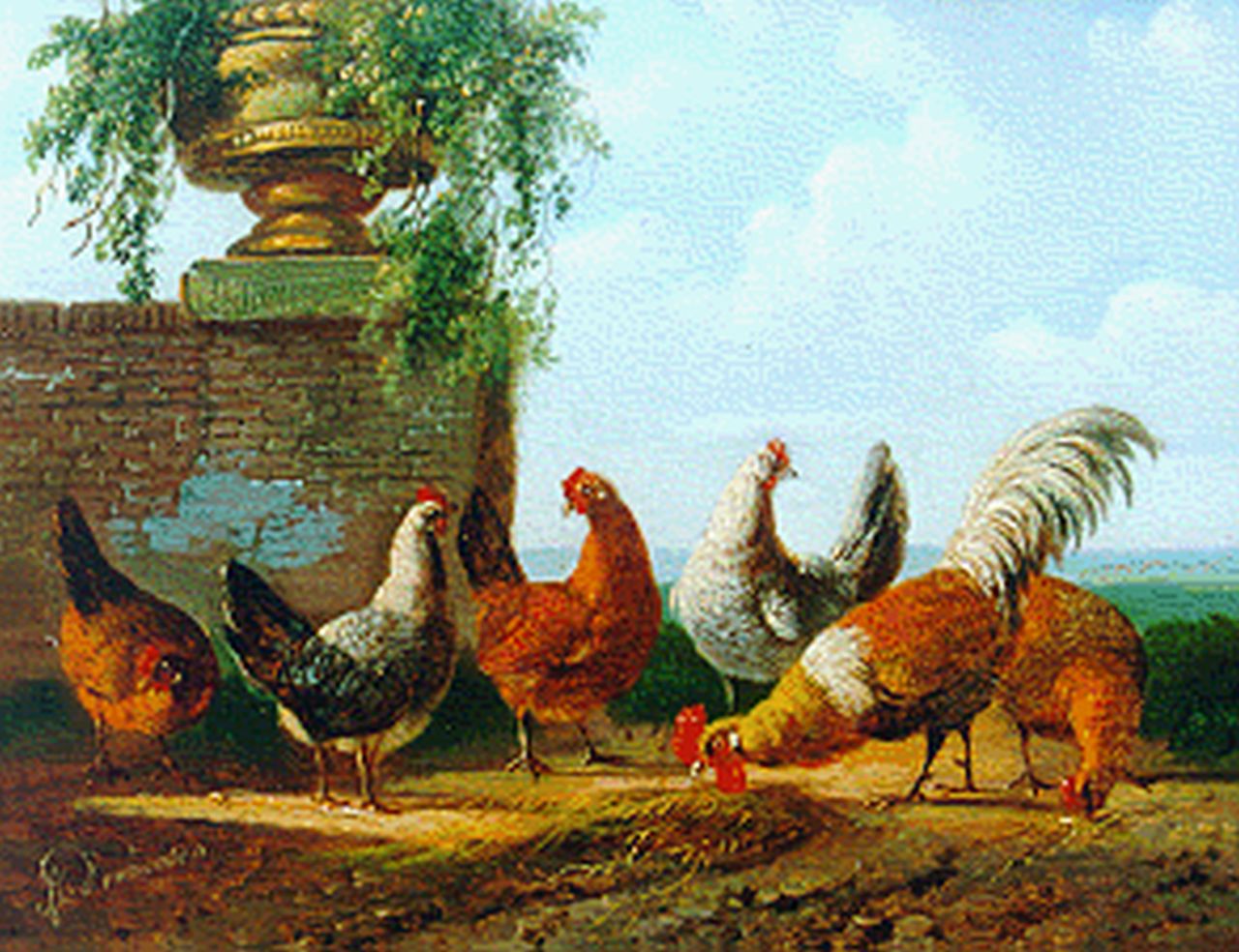 Albertus Verhoesen kunstwerk • schilderij • voorheen te koop Haan met vijf kippen
