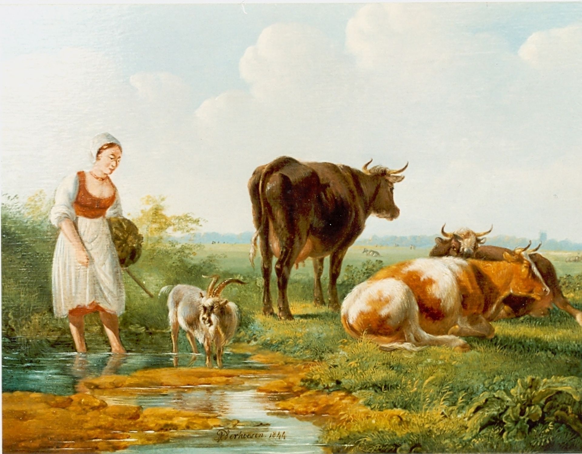 Albertus Verhoesen kunstwerk • schilderij • voorheen te koop Herderin met koeien en geitje bij een plas