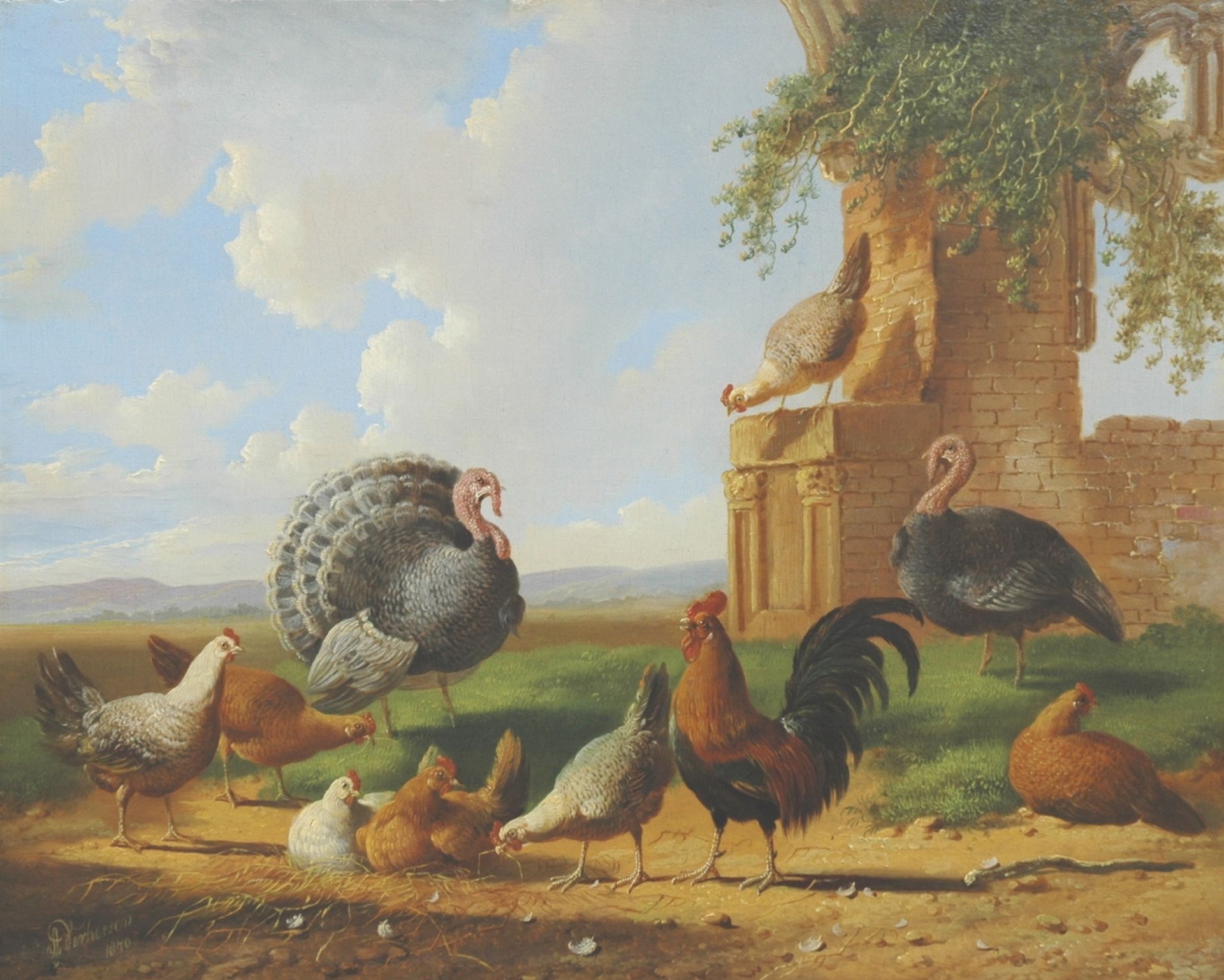 Albertus Verhoesen kunstwerk • schilderij • voorheen te koop Kalkoenen en pluimvee in een landschap