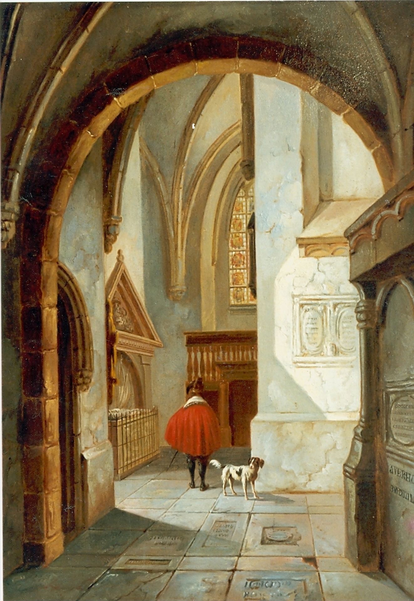 Albertus Verhoesen kunstwerk • schilderij • voorheen te koop Kerkinterieur met man en hond