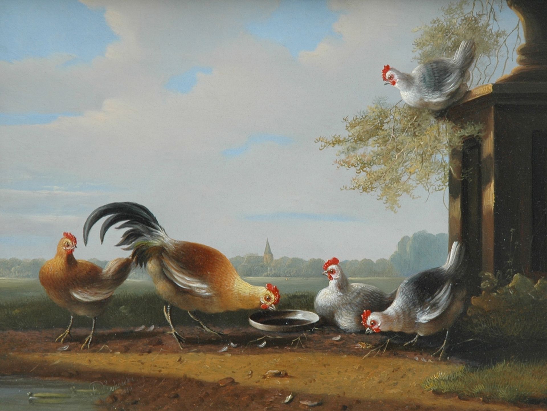 Albertus Verhoesen kunstwerk • schilderij • voorheen te koop Kippen bij een sokkel met tuinvaas