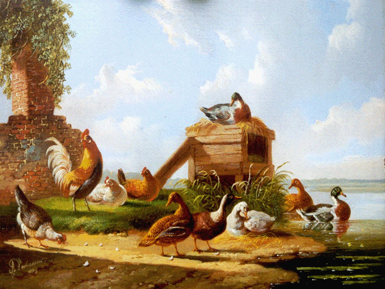 Albertus Verhoesen kunstwerk • schilderij • voorheen te koop Kippen en eenden langs de waterkant