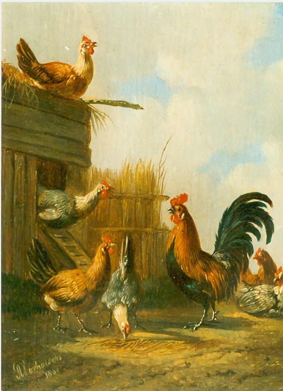 Albertus Verhoesen kunstwerk • schilderij • voorheen te koop Kippen en haan bij een kippenhok