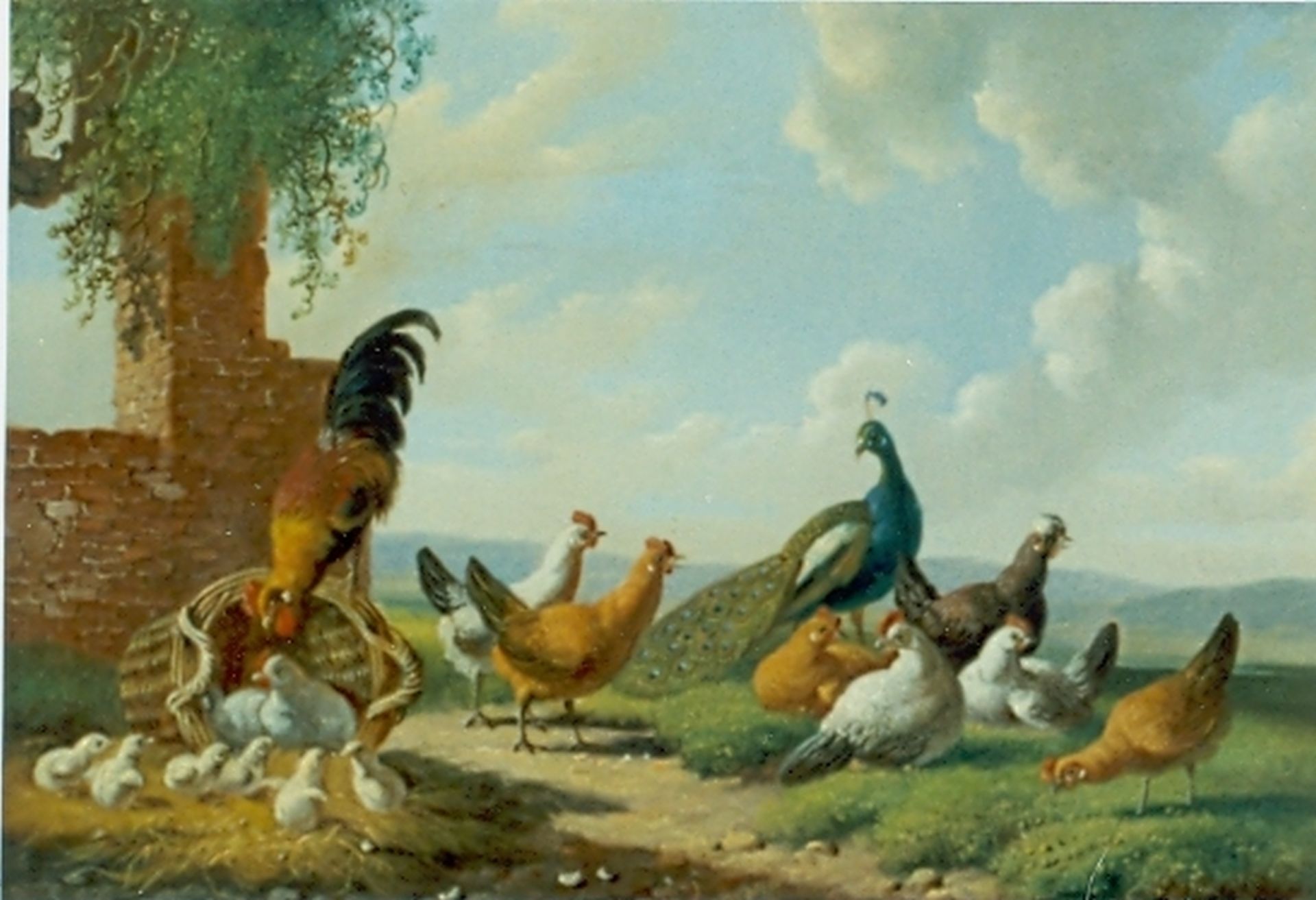 Albertus Verhoesen kunstwerk • schilderij • voorheen te koop Kippen en pauw op erf