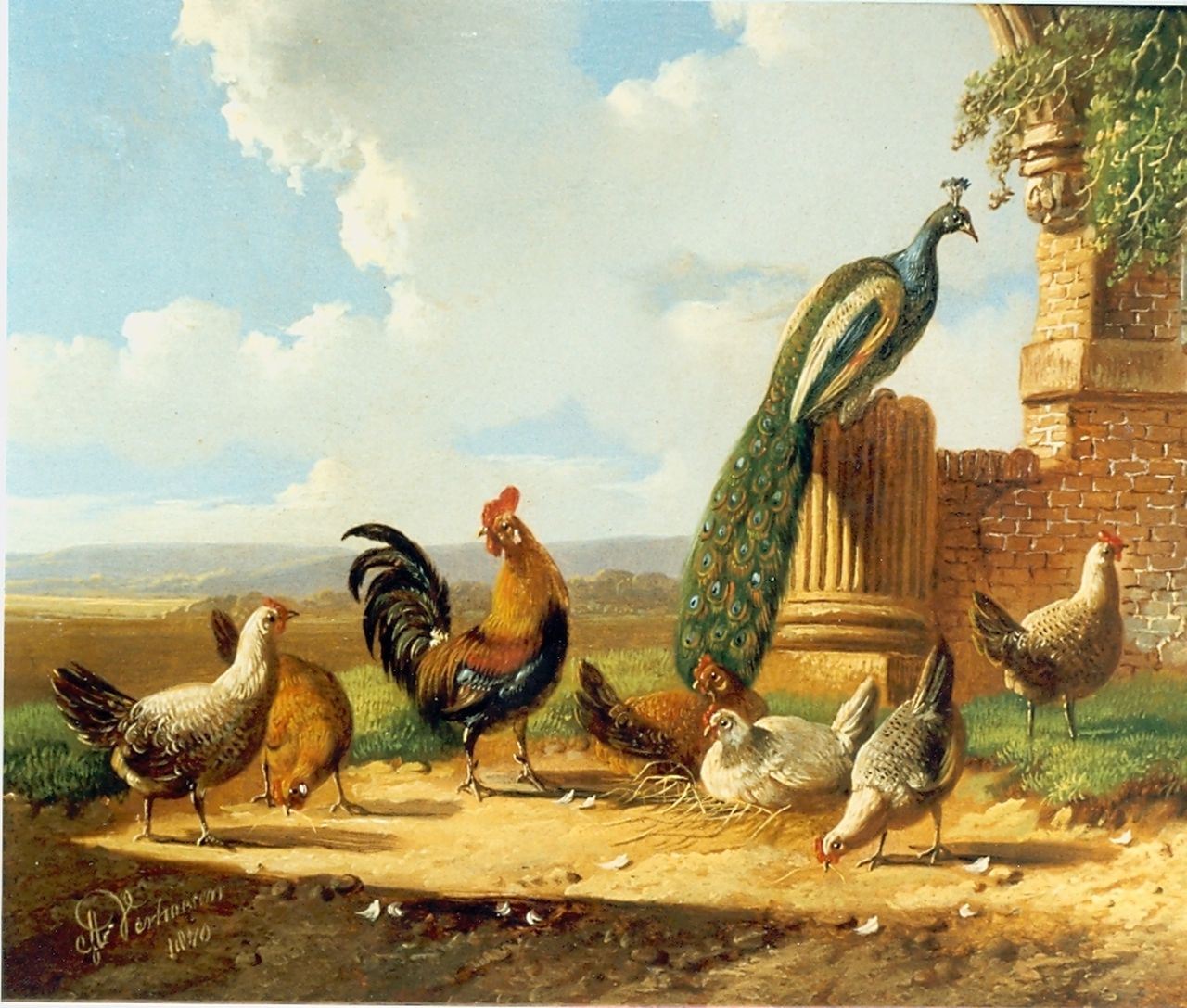 Albertus Verhoesen kunstwerk • schilderij • voorheen te koop Kippen en pauw op erf