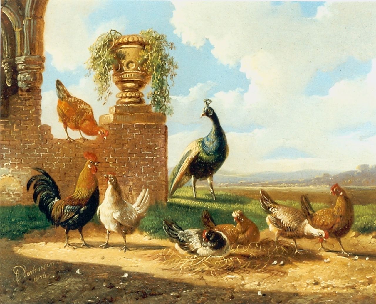 Albertus Verhoesen kunstwerk • schilderij • voorheen te koop Kippen en pauw op het erf
