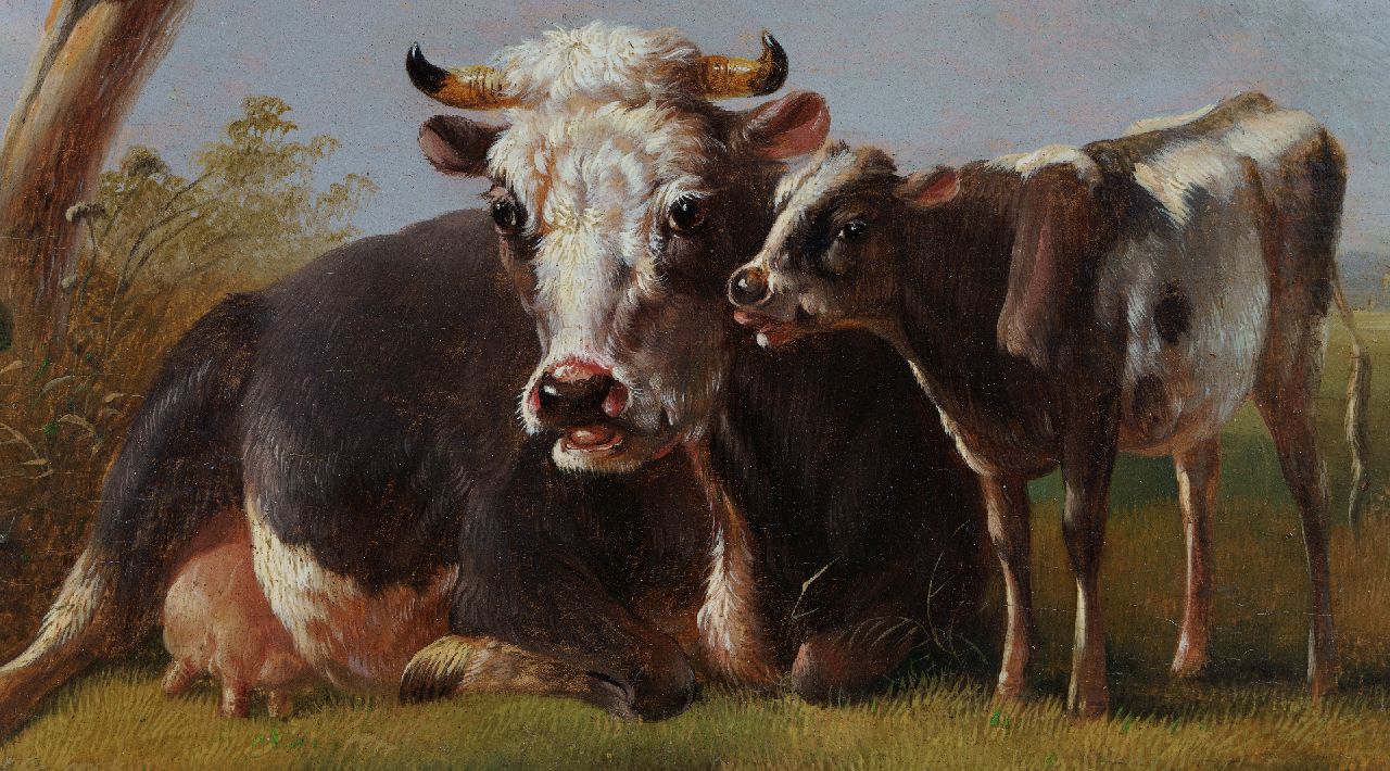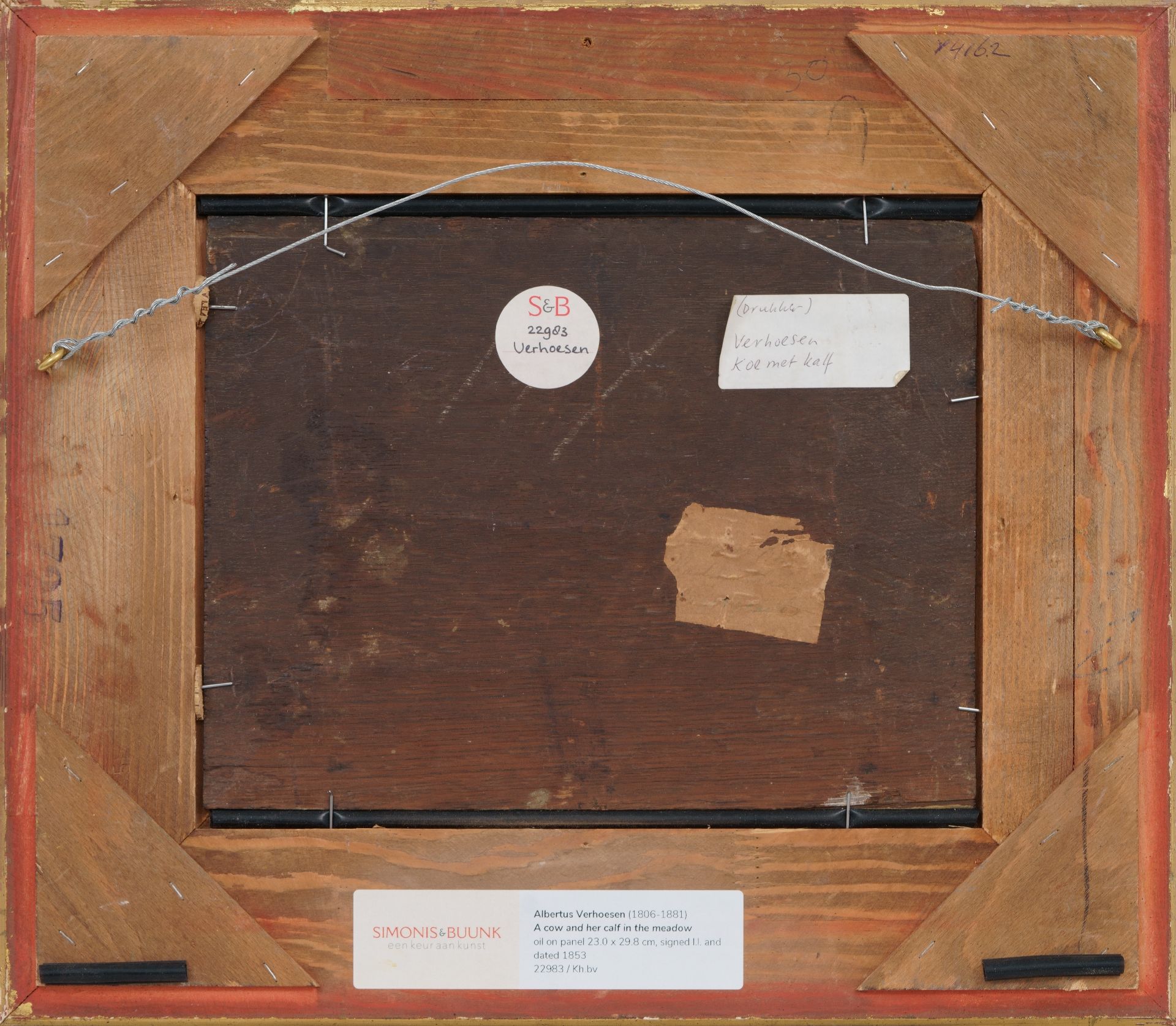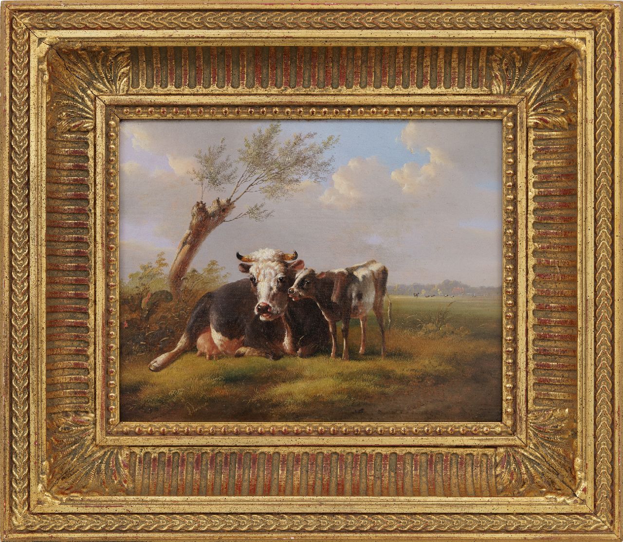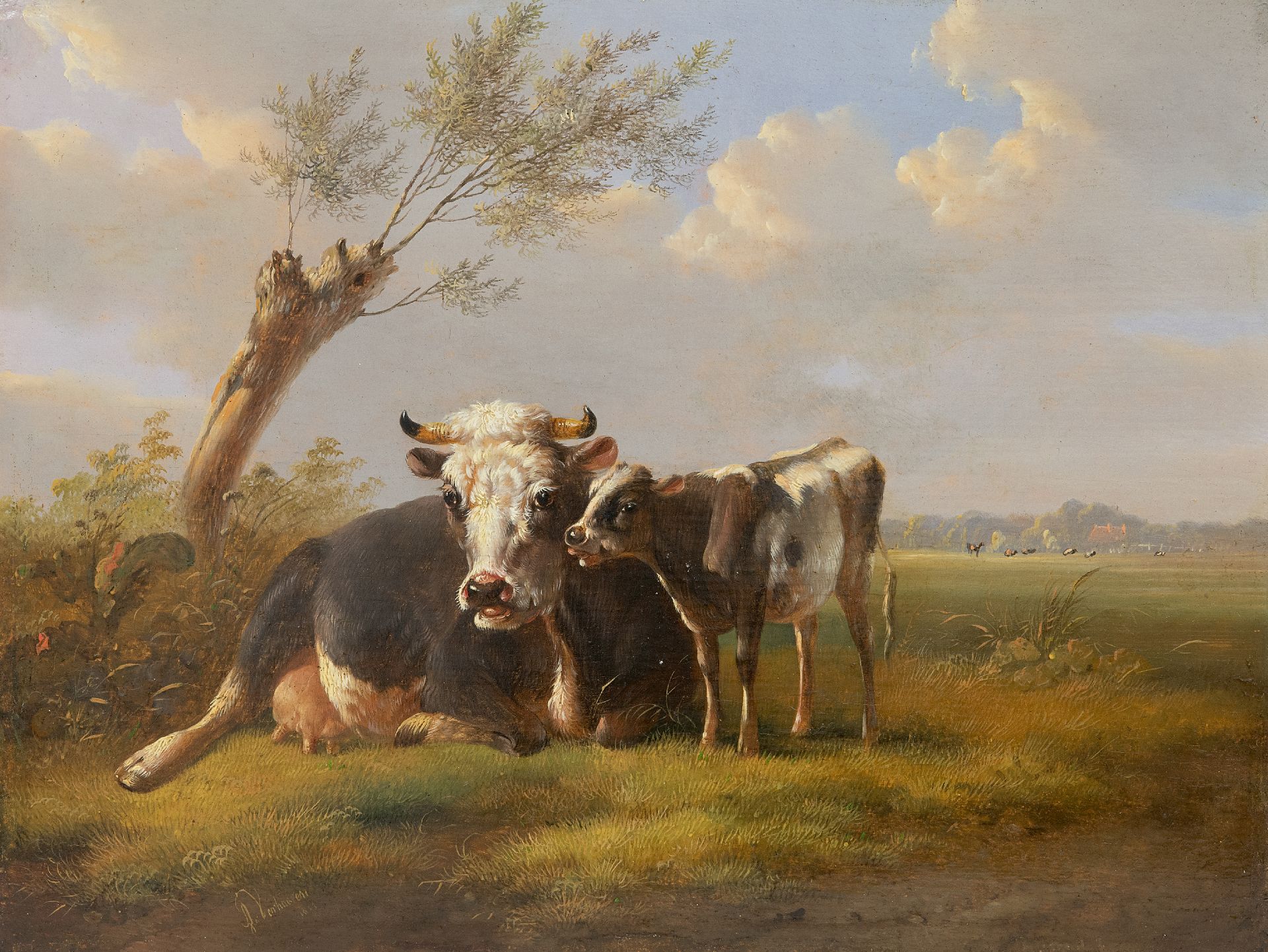 Albertus Verhoesen kunstwerk • schilderij • voorheen te koop Koe en haar kalf in een weidelandschap