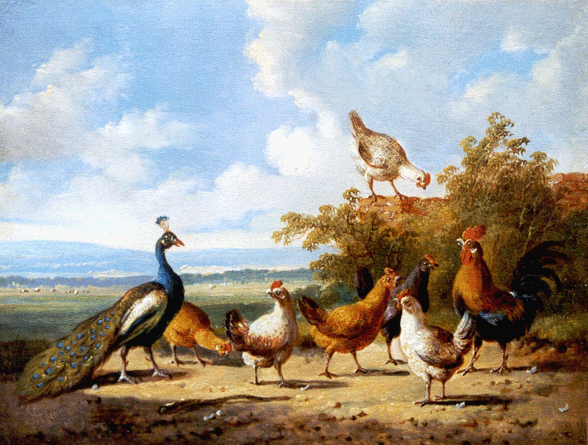 Albertus Verhoesen kunstwerk • schilderij • voorheen te koop Landschap met pluimvee en een pauw