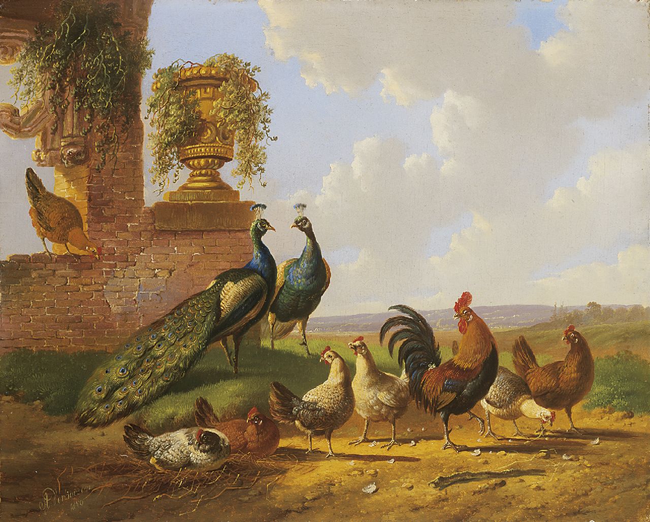 Albertus Verhoesen kunstwerk • schilderij • voorheen te koop Pauwen en pluimvee bij een ruïne