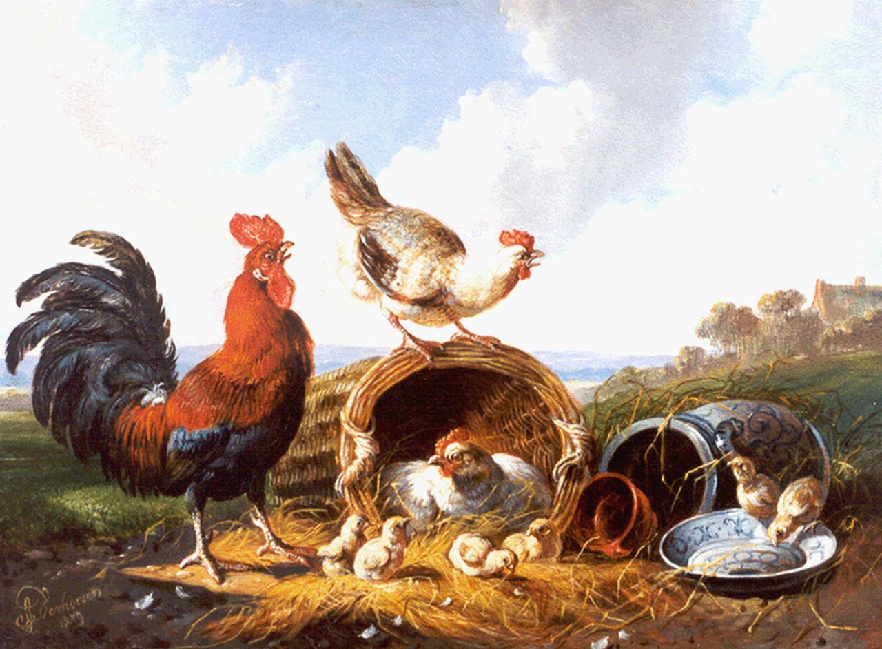 Albertus Verhoesen kunstwerk • schilderij • voorheen te koop Pluimvee bij een mand en Keulse pot (tezamen met 13655)