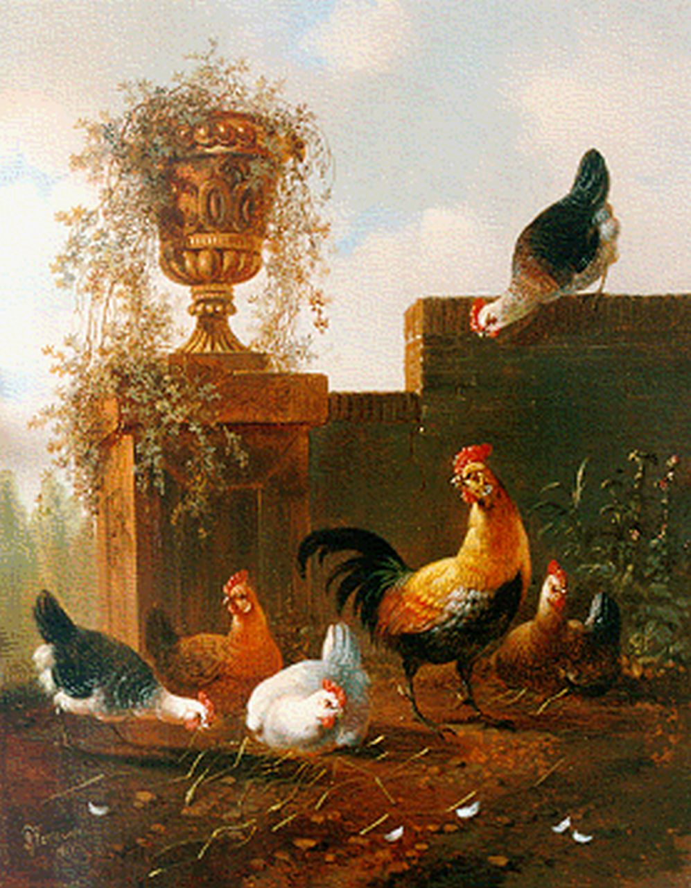 Albertus Verhoesen kunstwerk • schilderij • voorheen te koop Pluimvee bij een muurtje