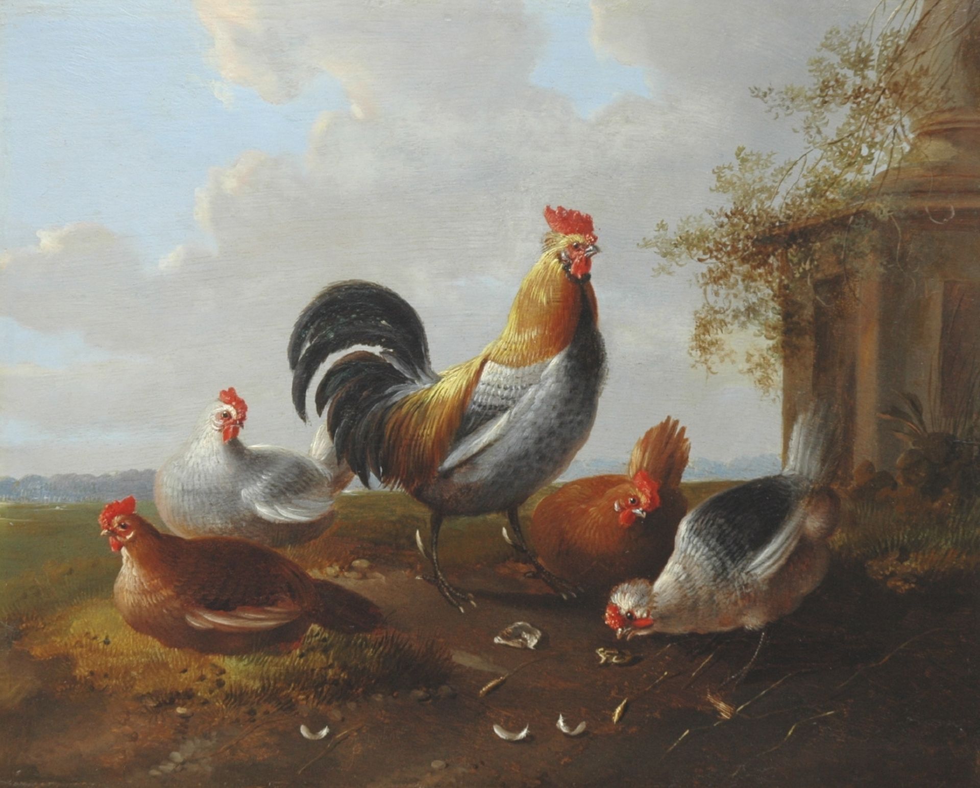 Albertus Verhoesen kunstwerk • schilderij • voorheen te koop Sierkippen en een haan