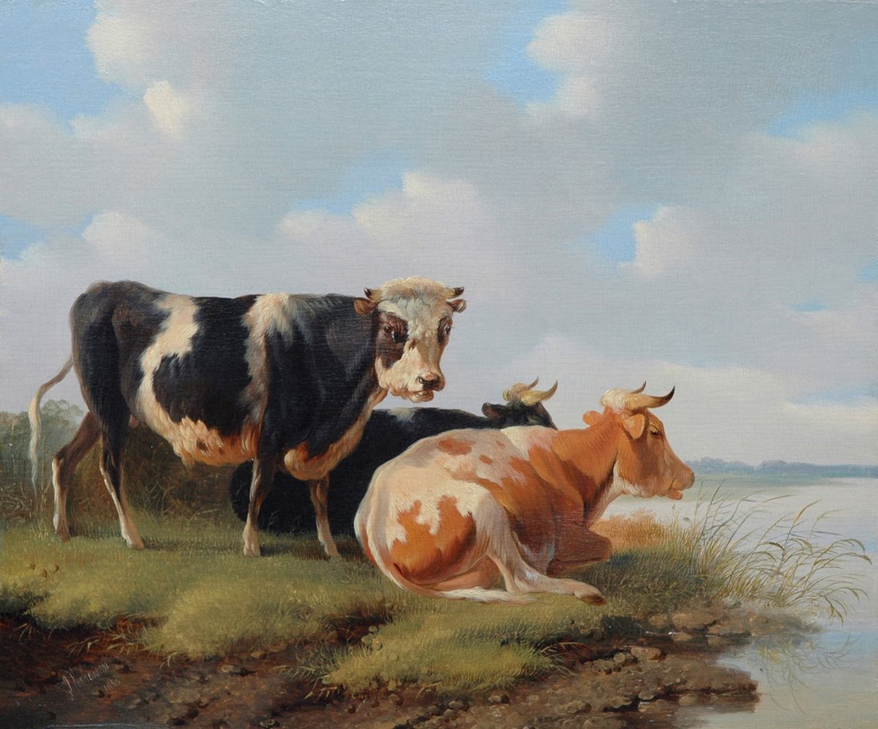 Albertus Verhoesen kunstwerk • schilderij • voorheen te koop Stier en koeien bij het water