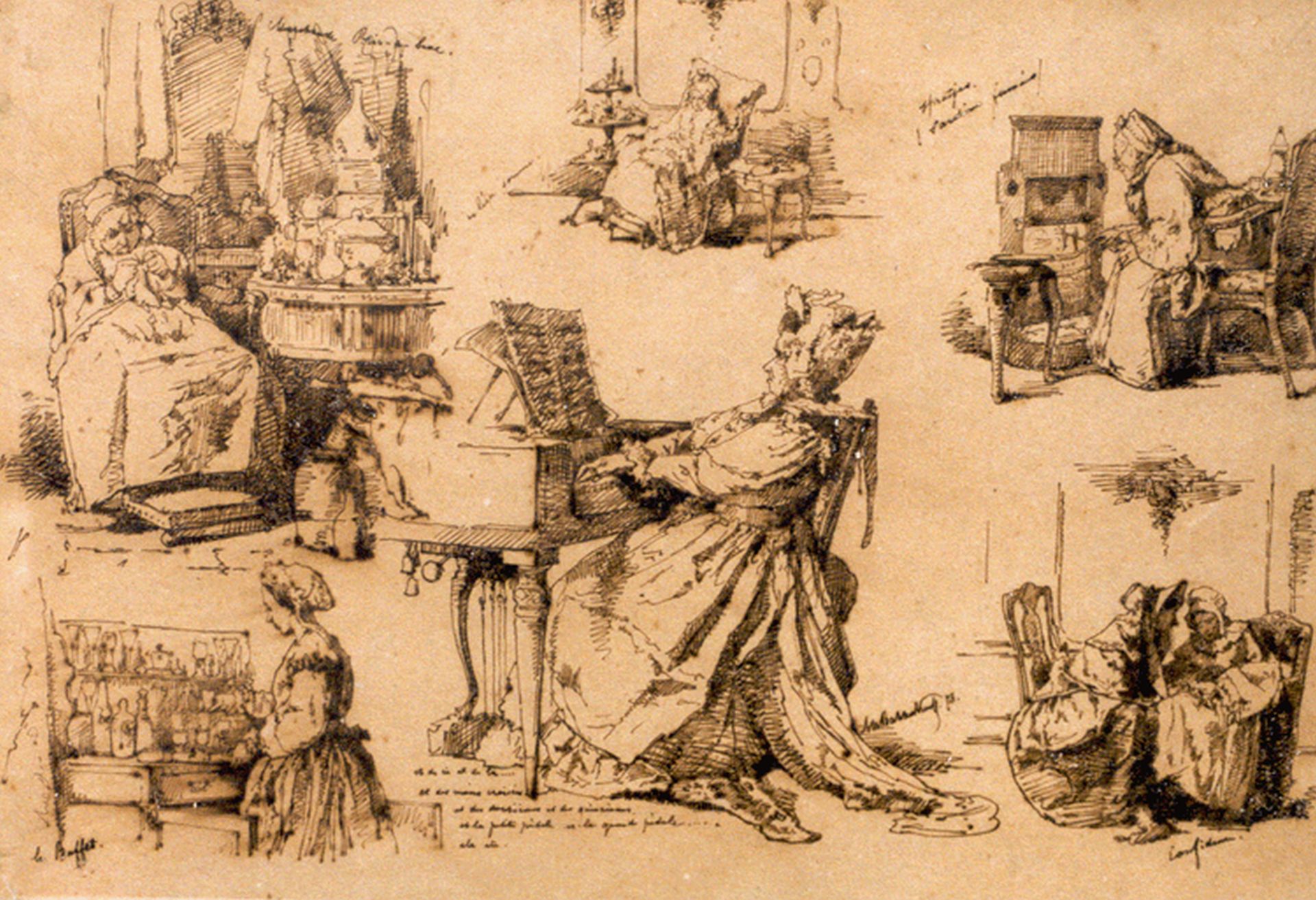annotatie: 'Marchande Bric a Brac; le Buffet; un léger somme; Et de ci et de la ......; sprotjes (sardines fumées); Confidence'.