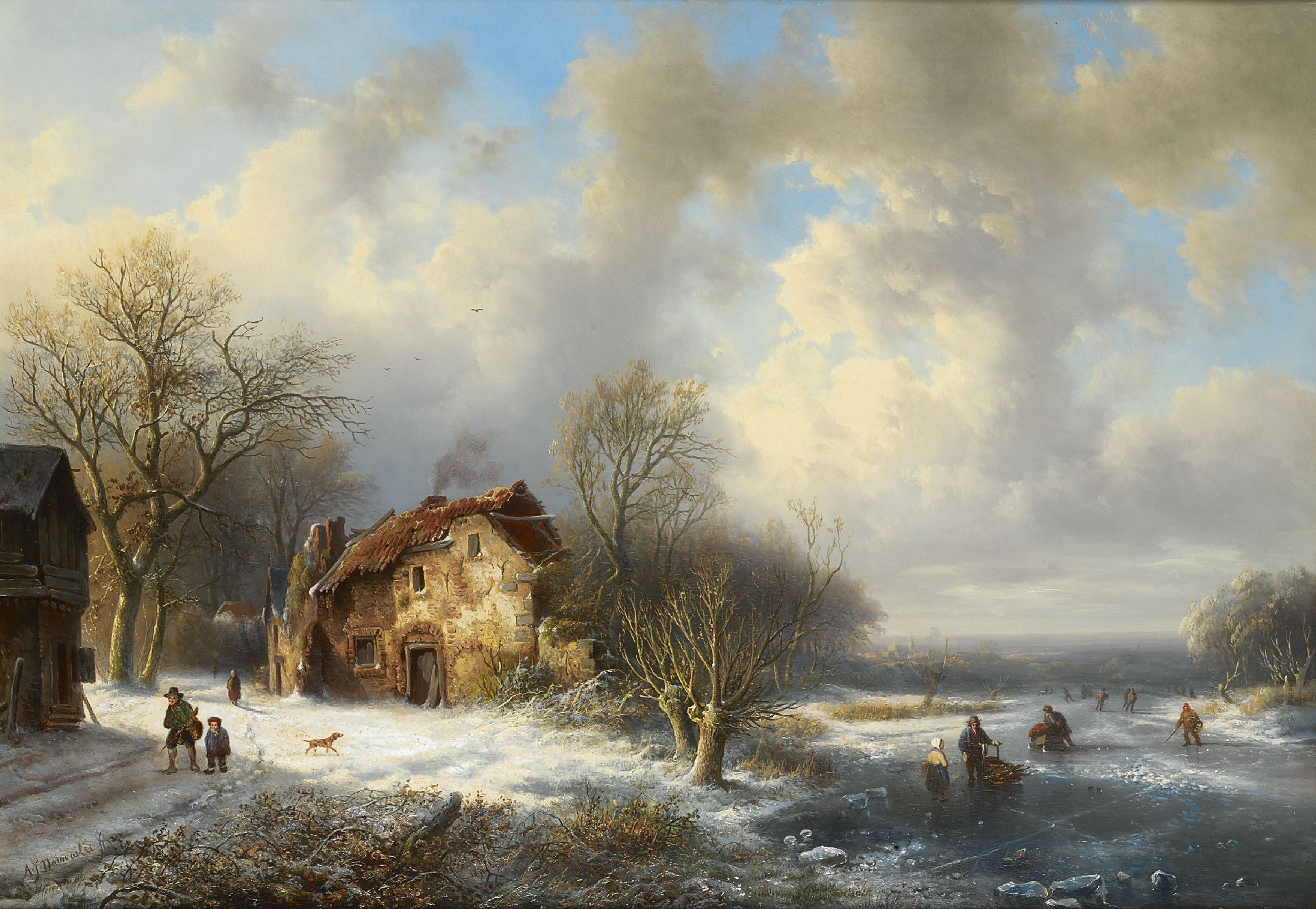 Alexander Joseph Daiwaille kunstwerk • schilderij • voorheen te koop Winterlandschap met schaatsers