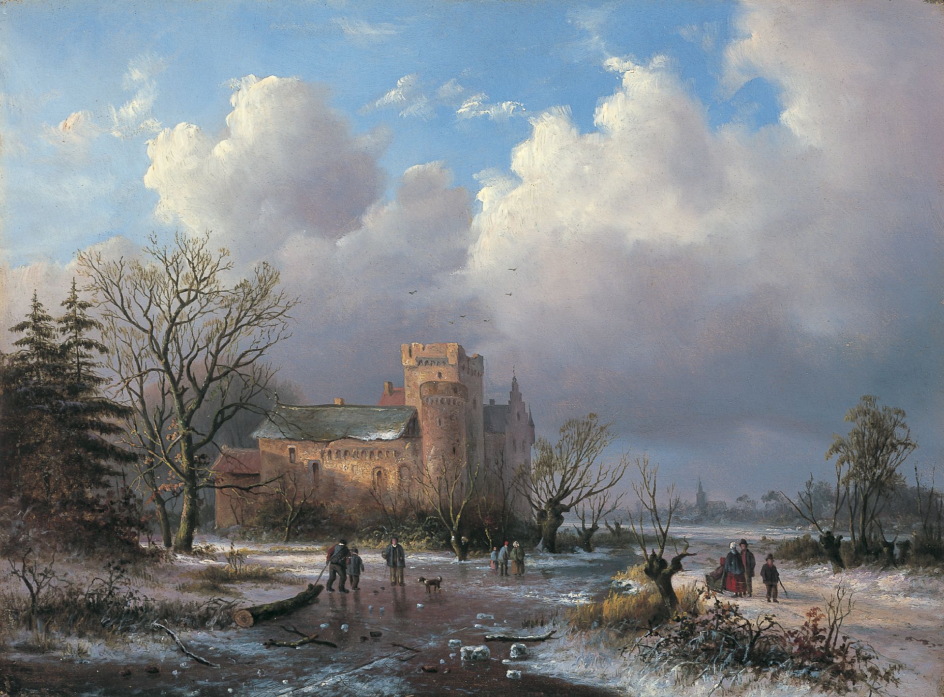 Alexander Joseph Daiwaille kunstwerk • schilderij • voorheen te koop Winters rivierlandschap met kasteel