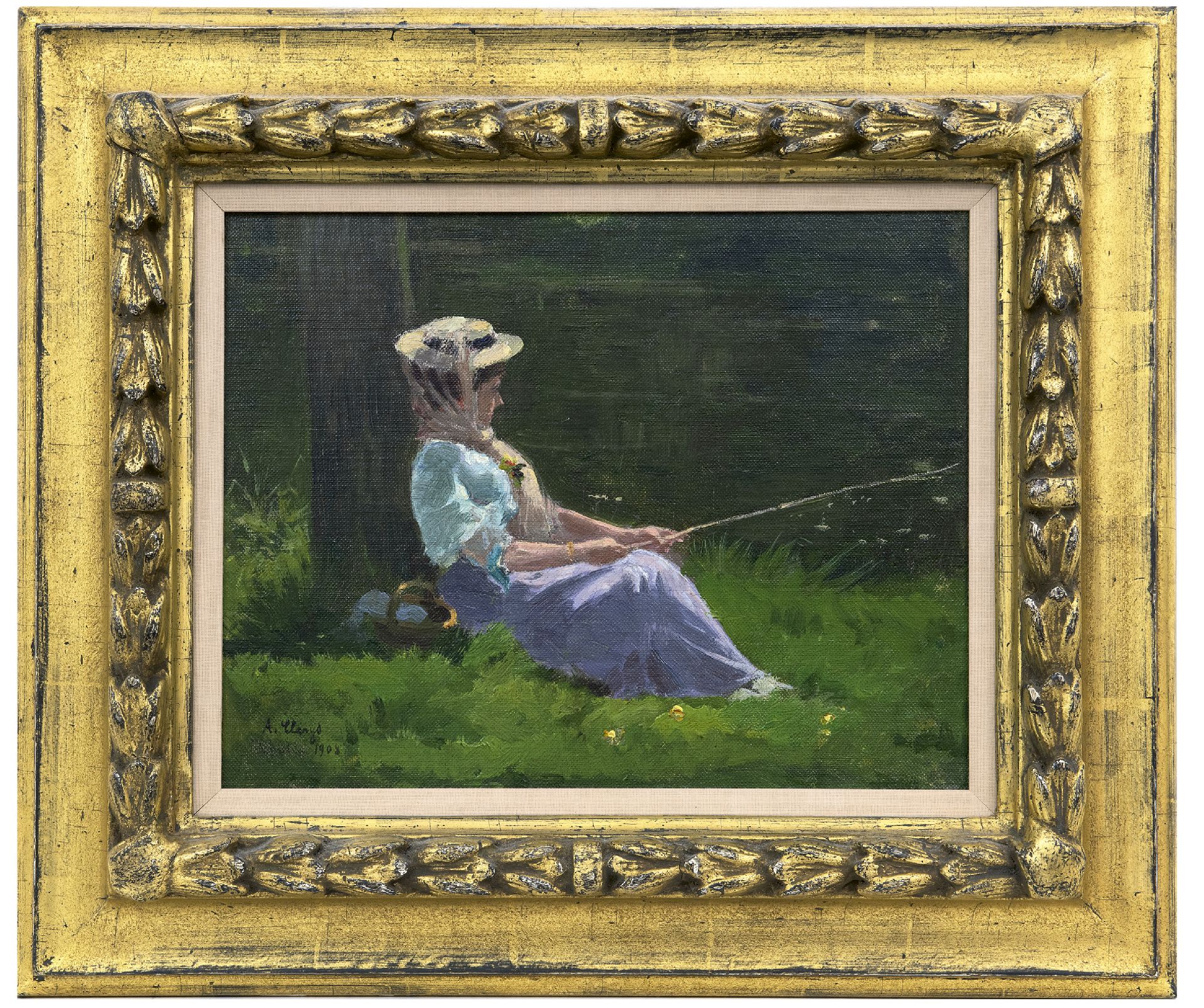 olieverf op doek op paneel 24,2 x 30,9 cm, gesigneerd linksonder en gedateerd 1908